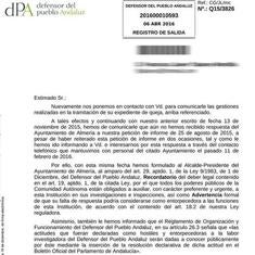 Tal y como se puede leer en el escrito, esta institución le hace saber a los vecinos de este barrio las dificultades que están teniendo para obtener información precisa de parte del Consistorio. «Hemos de comunicarle que aún no hemos recibido respuesta del Ayuntamiento de Almería a nuestra petición de informe en dos ocasiones, tal y como le hemos ido informando a usted e interesarnos por esta respuesta a través del contacto telefónico que mantuvimos con personal del citado Ayuntamiento el pasado 11 de febrero», se puede leer en una misiva en la que se le recuerda al alcalde el «deber legal» de todos los poderes públicos de «auxiliar, con carácter preferente y urgente», a la institución en sus inspecciones.