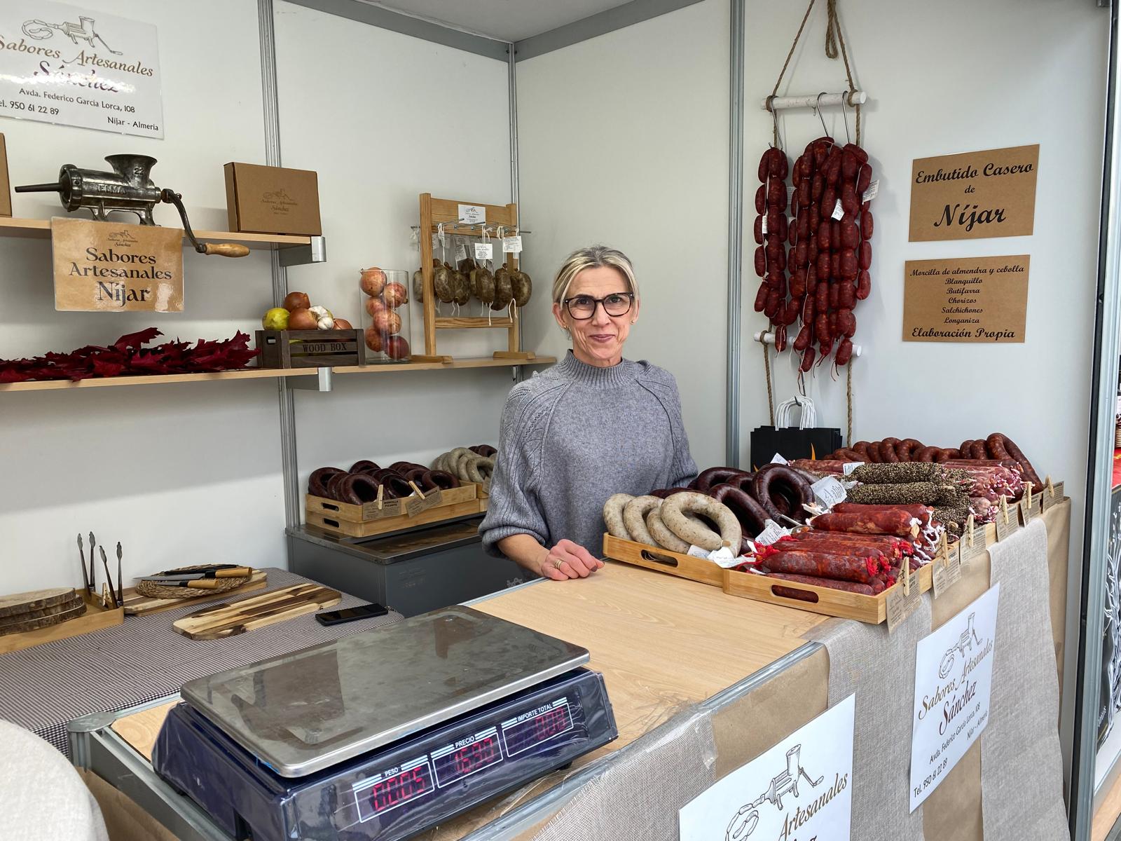 Desde Níjar, María del Mar presenta la propuesta de Sabores Artesanales Sánchez, un negocio de 18 años que recupera las recetas de sus abuelos. «Nuestra morcilla es lo que más fama tiene. Le ponemos almendra molida y cebolla. Trabajamos chorizos, salchichón, (incluido uno recubierto de pimienta), y el blanquillo, muy común en nuestra zona», explica.