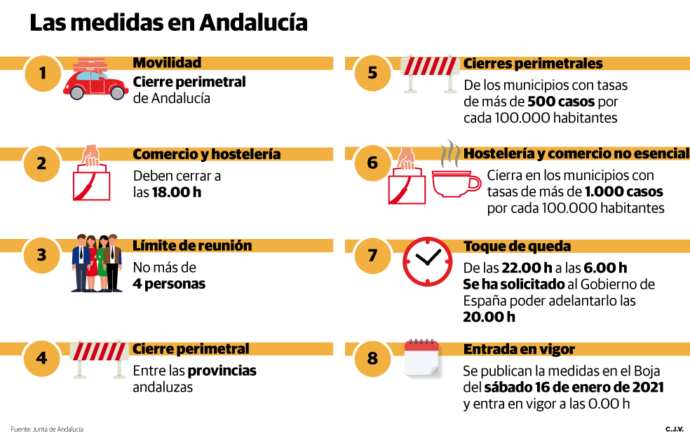 En el resto de Andalucía, se adelanta el cierre de los abres y los comercios a las 18 horas. Las reuniones, por otra parte, quedan limitadas a cuatro personas.