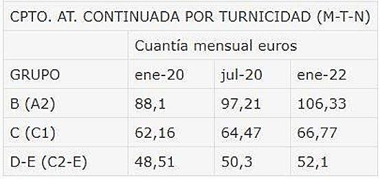 - Modificar las cuantías correspondientes al complemento de atención continuada por turnicidad, que queda fijado en las siguientes cuantías: