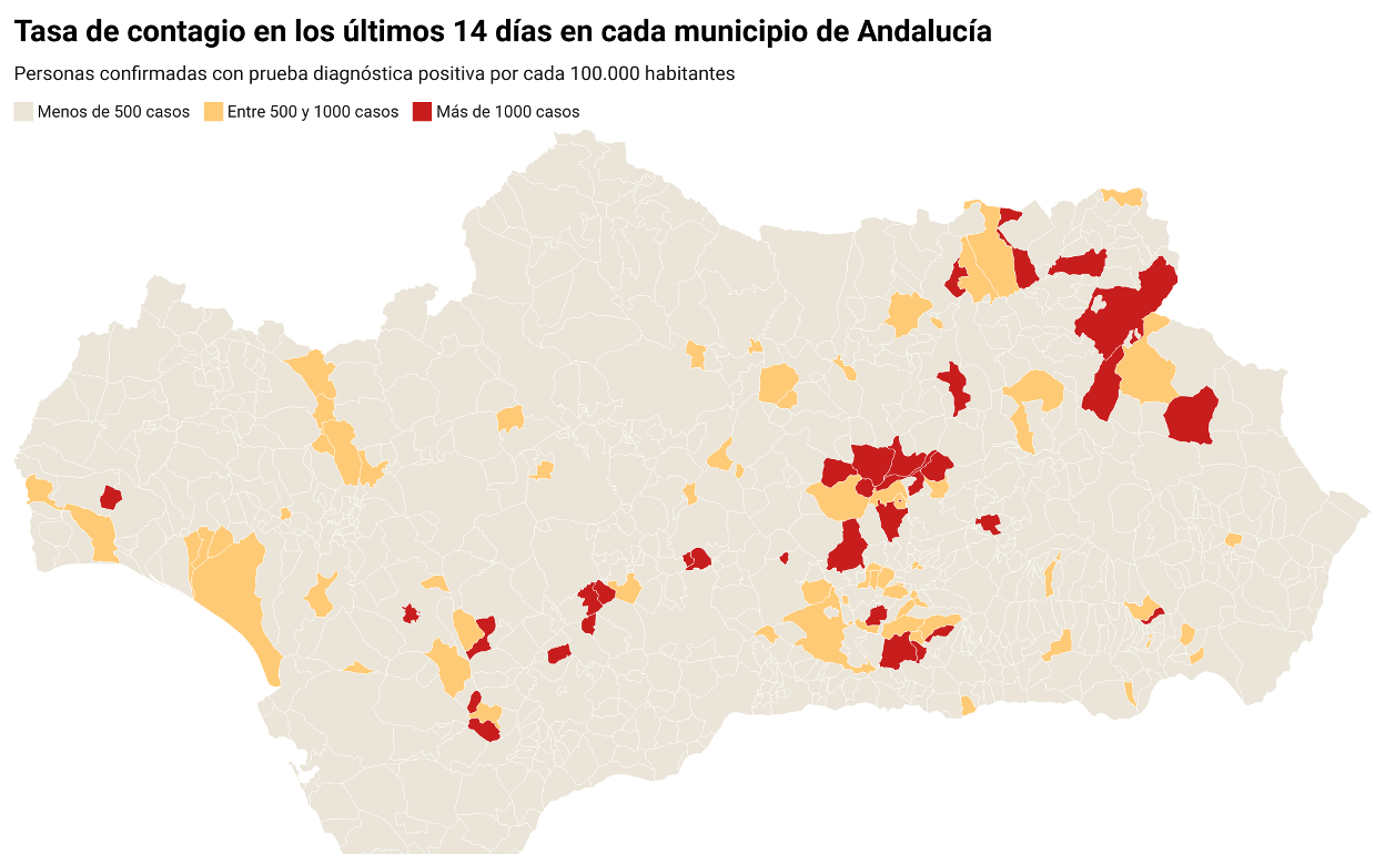 Los municipios que superen la 'tasa 1.000' sufrirán las restricciones más duras, ya que ser verán obligados al aislamiento perimetral y a cerrar bares y negocios no esenciales; mientras que los que se sitúen con un índice de contagios mayor a 500 por cada 100.000 habitantes durante las últimas dos semanas quedarán cerrados perimetralmente. Además, dede el domingo habrá numerosos municipios de Andalucía que cerrarán bares a las 20 horas, entre ellos, Sevilla, Córdoba, Granada y Almería.