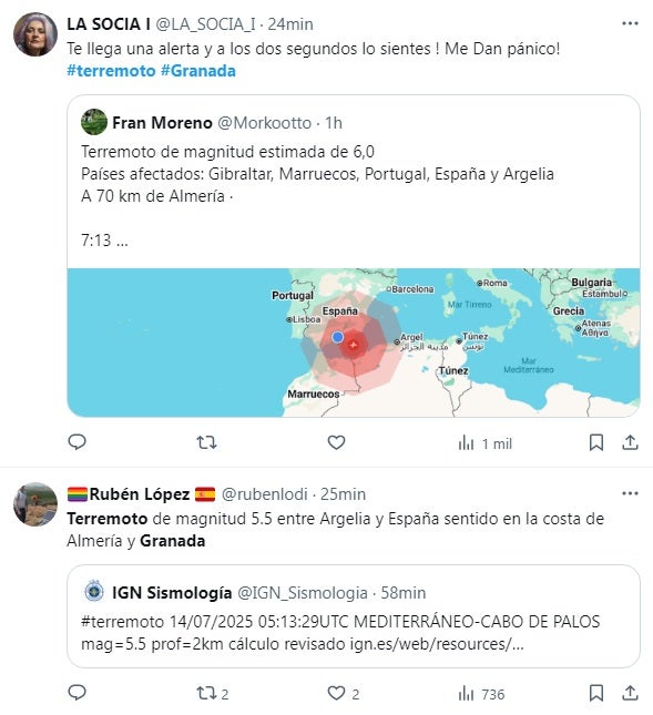 Decenas de reacciones en Almería y Granada por el terremoto del Mediterráneo