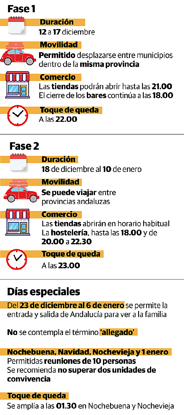 La Junta de Andalucía ha decidido aplicar, desde este sábado 18 de diciembre y hasta el 10 de enero, una «desescalada» progresiva de las restricciones ... actualmente vigentes para frenar la pandemia del coronavirus, en dos fases, para aumentar la movilidad en las fechas de Navidad.