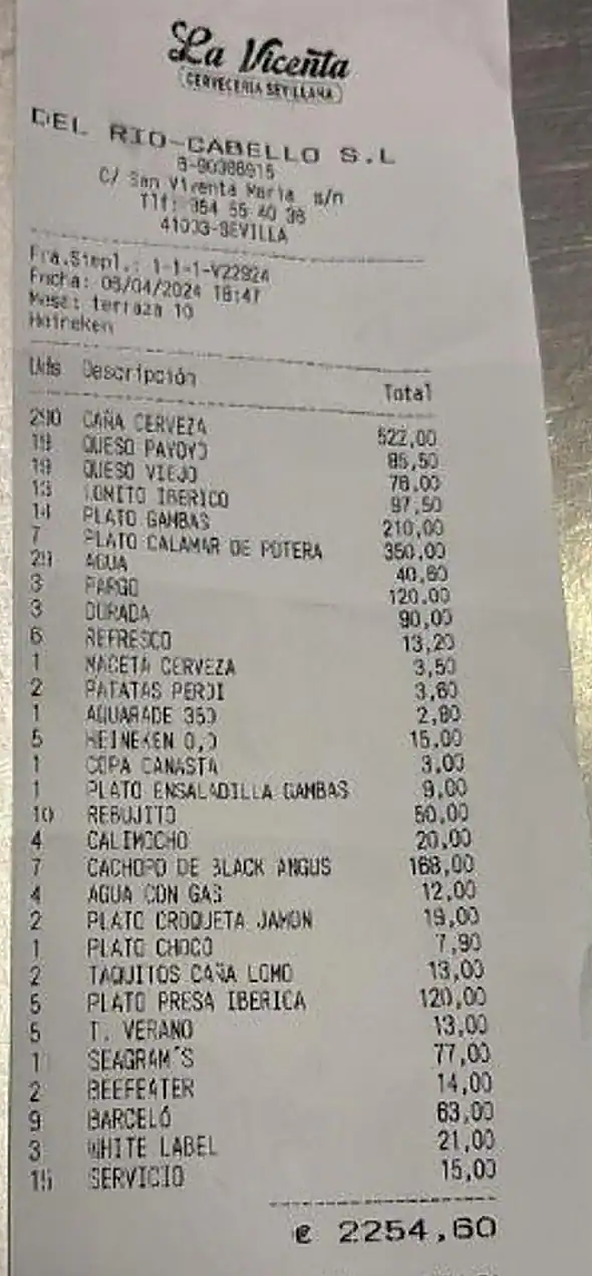 La cuenta corresponde a un ticket de la cervecería La Vicenta, ubicada en la calle Santa Vicenta María, en el casco antiguo de la ciudad. Y el montante total de la misma asciende hasta los 2.254,60 euros, una cantidad que ha hecho que miles de usuarios en TikTok y X (red social antes llamada Twitter) se hicieran la misma pregunta: ¿cuánta gente había en la mesa para un consumo tan grande?