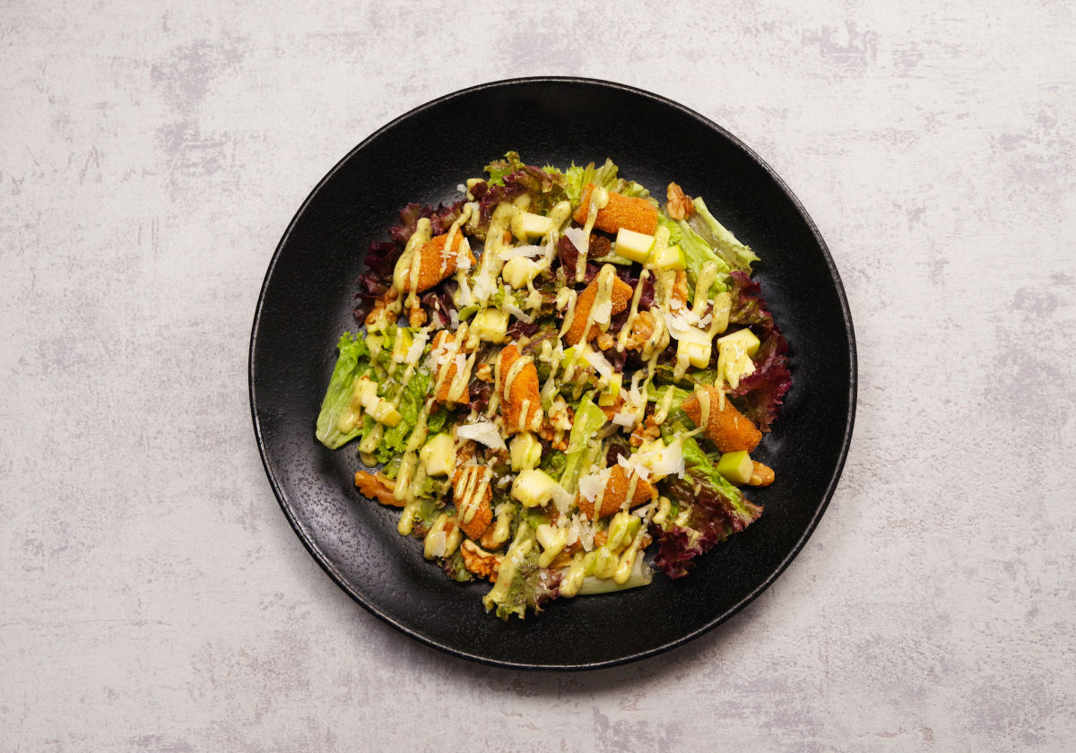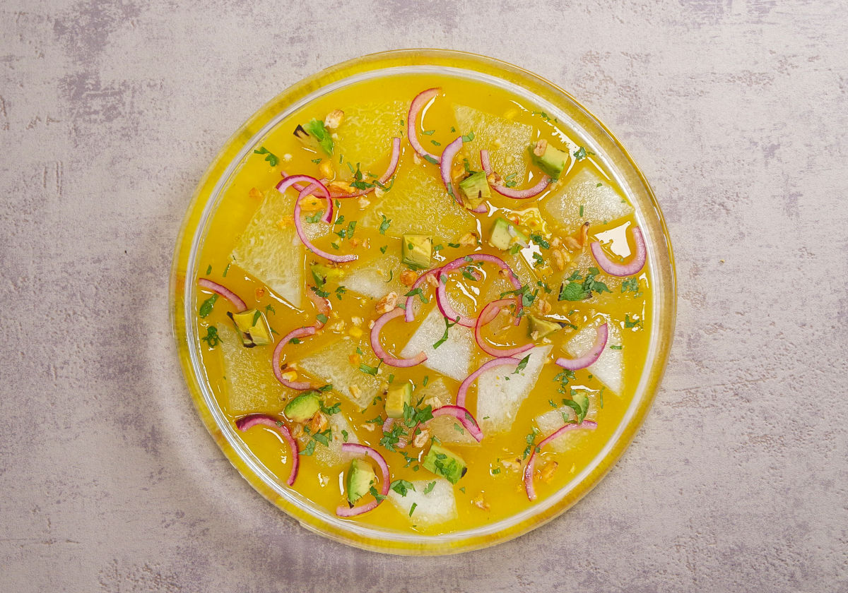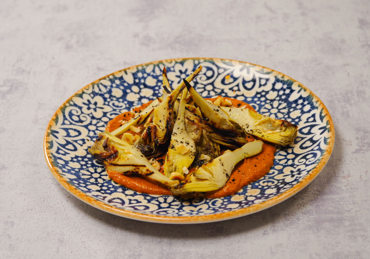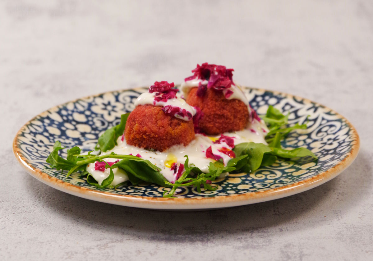 Entre sus propuestas está la ensalada césar vegana, con brotes tiernos, tiras de heura crujiente, manzana y frutos secos; o la ensaladilla de encurtidos, acompañada de mayonesa de piquillo, espárrago agridulce y alcachofa confitada. También destacan platos que conectan con otros lugares del mundo, como el tiradito de melón macerado en lima, con sopa de mango, aguacate a la brasa y salsa sriracha; los tacos de “heurita pibil”, marinados en achiote y naranja; o el falafel de remolacha, servido con mayonesa de pepino.
