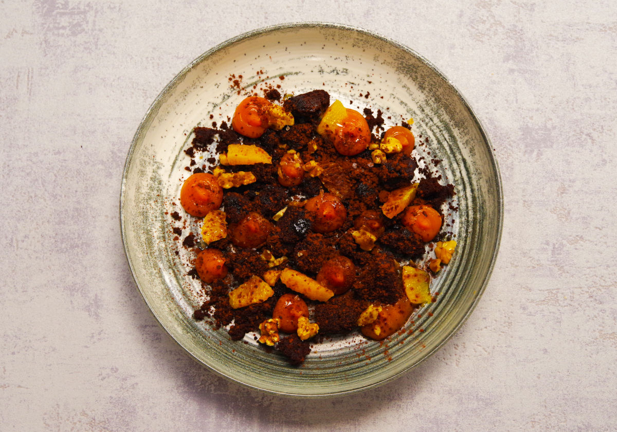 Los postres mantienen la misma línea de creatividad: arroz con leche de almendras caramelizado, panna cotta de curry amarillo con chutney de mango, migas de cacao y boniato con macadamias y naranja, o propuestas más clásicas como el coulant de chocolate y la manzana con crumble y helado de vainilla.