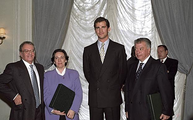 EFE Tico Medina recibió innumerables reconocimientos por su espléndida labor periodística. En Guadix recogió con gran emoción el Premio de Periodismo Pedro Antonio de Alarcón, un personaje por el que sentía verdadera admiración por su condición de escritor y cronista de guerra. En la imagen, tras recibir una distinción del entonces príncipe Felipe junto a Victoria Prego y Carlos Luis Álvarez.