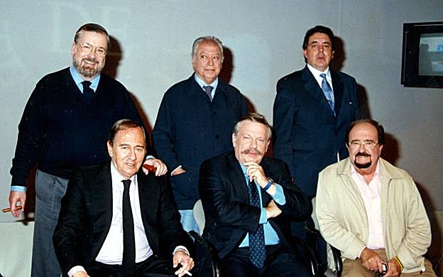EFE Tico formaba parte de una generación de 'viejos rockeros' del periodismo que marcaron un antes y un después en el oficio. En la imagen, posando junto a Chicho Ibáñez Serrador, Martínez Regalado, Pérez Puig, José María Íñigo y el mítico presentador del Festival de Eurovisión, José Luis Uribarri.