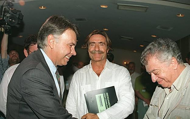 EFE Tico Medina nunca renunció a su condición de reportero. Incluso cuando pisaba moqueta para participar en eventos junto a presidentes del Gobierno como Felipe González. En la foto, saludando a Felipe ante la mirada sonriente de su amigo aventurero Miguel de la Quadra Salcedo en 1994.