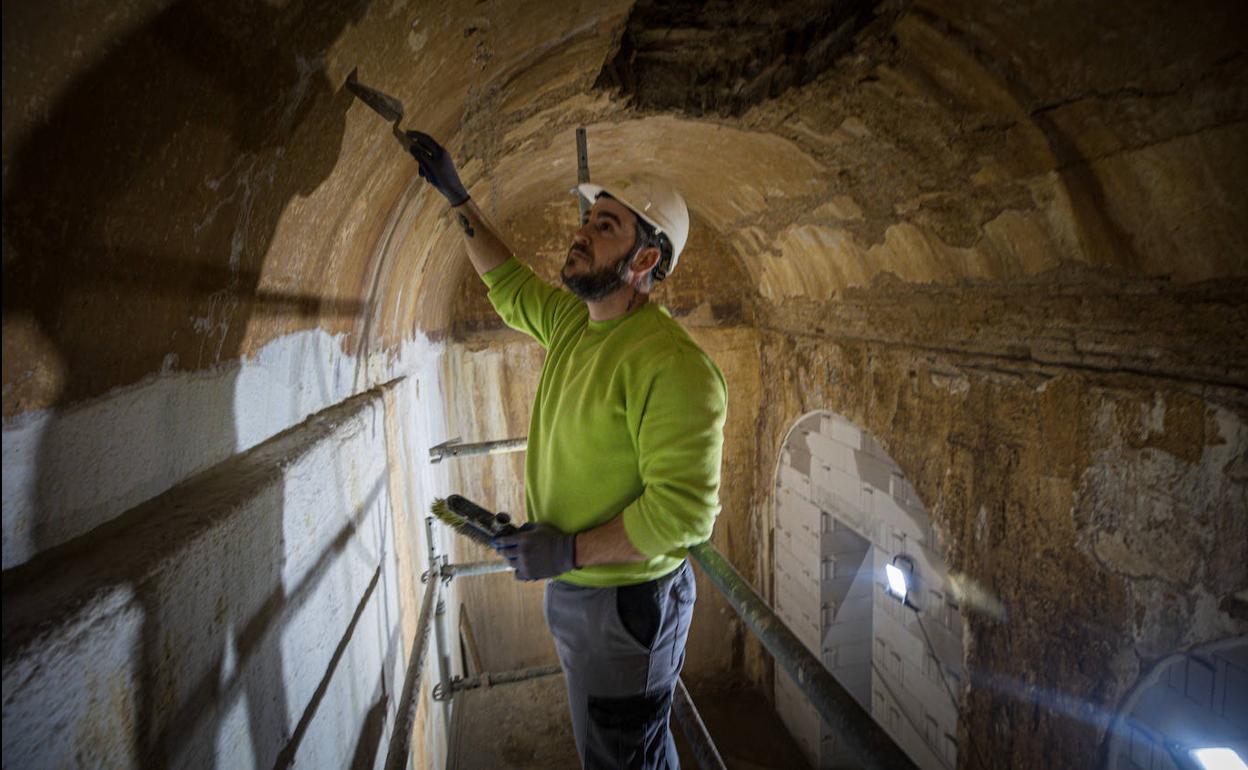 Las vallas de obra están presentes en la plaza del Carlos V, donde se distribuye la vida de la Alhambra. Ahí, los visitantes fotografían la majestuosidad del edificio y también hacen cola y se preparan para conocer el monumento por dentro. Las vallas de obra están ahora en la superficie. Nadie se imagina que se están reformando las galeradas de suelo, un espacio histórico, oculto a las miradas pero que forma parte del patrimonio alhambreño. El agua era y es un elemento vital en la visita, pero también un arma de doble filo que va desgastando la piedra con el tiempo. Nada se resiste a la humedad. Bajan los técnicos y la directora de la Alhambra, Rocío Díaz, tiene unos minutos de dudas. «Es un poco angosto», reconocen los encargados de la obra que explican que trabajar en estas condiciones es un poco complejo. Baja al fin la directora que revisa esta obra lejos de las miradas de cualquiera. Para los materiales, usan un montacargas. Es como reforzar una mina en las entrañas del monumento más visitado del país. Para acceder al aljibe se necesita un equipo de protección y descender por una escalerilla colocada en el minúsculo pozo por el que se baja. La estrechura y la oscuridad imponen al principio y dejan paso, abajo, de un espacio amplio por donde transcurre la historia al que hay que quitar las grietas. Arriba el sol hace brillar los palacios y abajo, huele a silencio. Este espacio constructivo conserva parte del relato alhambreño. Almacenaba agua y ahora tiene que ser reparado porque esta va lamiendo poco a poco los ladrillos.