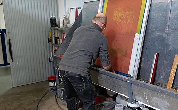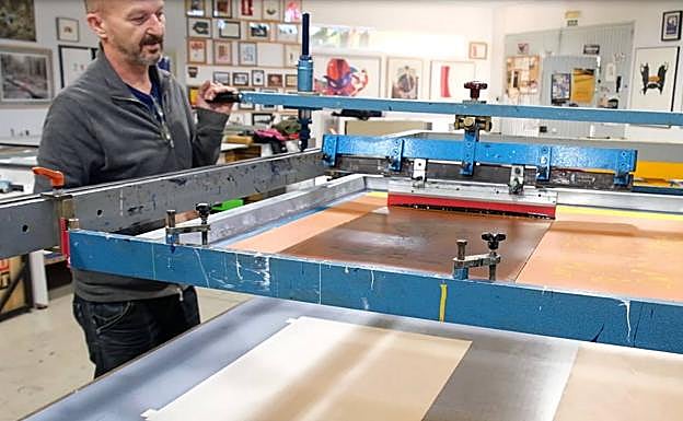 Tercer paso. La pantalla: Ese proceso genera una pantalla, una plancha que traslada a una mesa sobre la que se fija en una posición estable y, tras hace el vacío, con una regleta de goma se vuelca la tinta. Cada tinta requiere su propia pantalla. Hay serigrafía con dos tintas y otras, con hasta veinte. El tiempo estimado por tinta es de hora y media de trabajo.