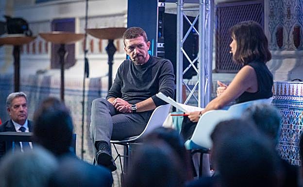El escenario elegido fue la imponente Sala Neomudéjar de la Facultad de Comunicación Audiovisual de la UGR, con el aforo completo. Elena Sánchez, periodista de TVE, condujo la entrevista a dos bandas, con Banderas presente e, irónicamente, Ríos vía telemática, desde Barcelona. «Este es un foro dedicado a Granada y a la cultura -dijo Sánchez-, dos palabras íntimamente relacionadas. Venimos a aprender de los que saben y, de esto, ellos son maestros».
