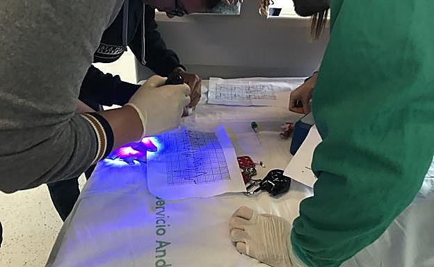 Otro caso: Los alumnos se encuentran con un electrocardiograma y tienen que identificar cuál de ellos tienen un infarto, cuál una fibrilación ventricular y cuál un flutter auricular. Cada uno va asociado a unos números que les permiten abrir un candado. «Si no sabes identificarlos, vas a tardar mucho...» También pueden toparse con una caja que sólo se puede tocar en condiciones estériles. «Hasta que no consiguen los guantes, la bata, el gorro... y se los colocan con la técnica estéril que vemos en clase, no pueden abrirla».