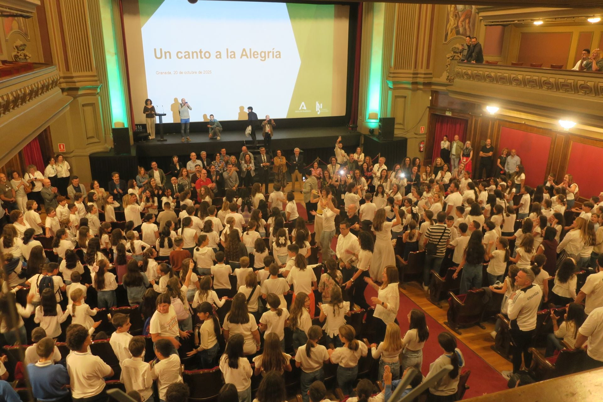 Una fiesta escolar de muy alto nivel es la que tuvo lugar en la mañana de este lunes en el Teatro Isabel la Católica. El ... motivo, el acto de presentación de los dos vídeos que grabaron juntos Miguel Ríos, la Orquesta Ciudad de Granada, el grupo de rock El Hombre Garabato, y 1.600 escolares de toda la provincia, pertenecientes a 32 centros participantes en el proyecto 'Un canto a la alegría', que se ha desarrollado durante el último año. Al acto acudieron María del Carmen Castillo, consejera de Educación; la alcaldesa de Granada, Marifrán Carazo, y Antonio Castro, como representante de la Fundación Miguel Ríos, ya que el artista no se ha podido desplazar a Granada, como hubiera sido su deseo, debido a un problema de salud.