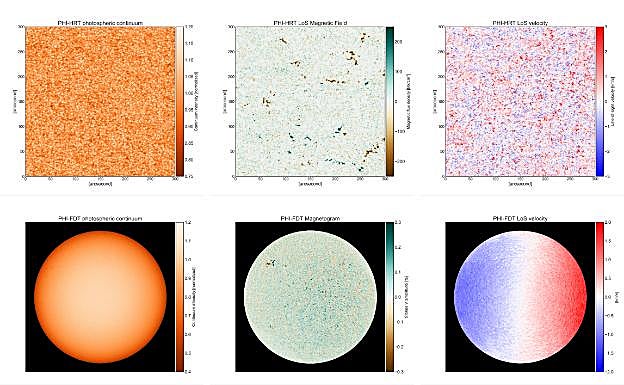 Las imágenes de la fila inferior son imágenes del disco solar completo realizadas con el telescopio de disco entero desarrollado por nuestro consorcio español. Durante esta fase de puesta a punto del instrumento, a estas imágenes aún no se les ha aplicado la acción del inversor electrónico. Las columnas de la izquierda representan la intensidad del continuo, en las que brillo equivale aproximadamente a temperatura: lo más brillante es lo más caliente. En la imagen del disco entero (abajo) apenas se distinguen estructuras porque la misión todavía se encuentra aún lejos del Sol como para diferenciarlas.