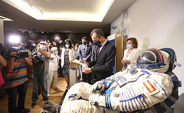 Pedro Duque ha cedido al Parque de las Ciencias su traje de astronauta y su silla espacial, que ya se exponen en la muestra 'Tocar el cielo. Explorar el espacio'. Imbroda, «muy agradecido», fue el encargado de recibir las dos piezas de manos del propio Duque, que guarda con Granada una estrecha relación: «He visto nacer y crecer el Parque de las Ciencias y me enorgullece ser partícipe de su historia, en alguna manera». A continuación, rodeado por multitud de autoridades políticas y culturas de la ciudad, el ministro dio una pequeña clase magistral sobre su equipamiento. «Está en posición de lanzamiento, como se dice. El traje -añadió, conforme se ponía a su lado- ya lo conocéis, seguro que habéis visto alguna foto en la prensa...».