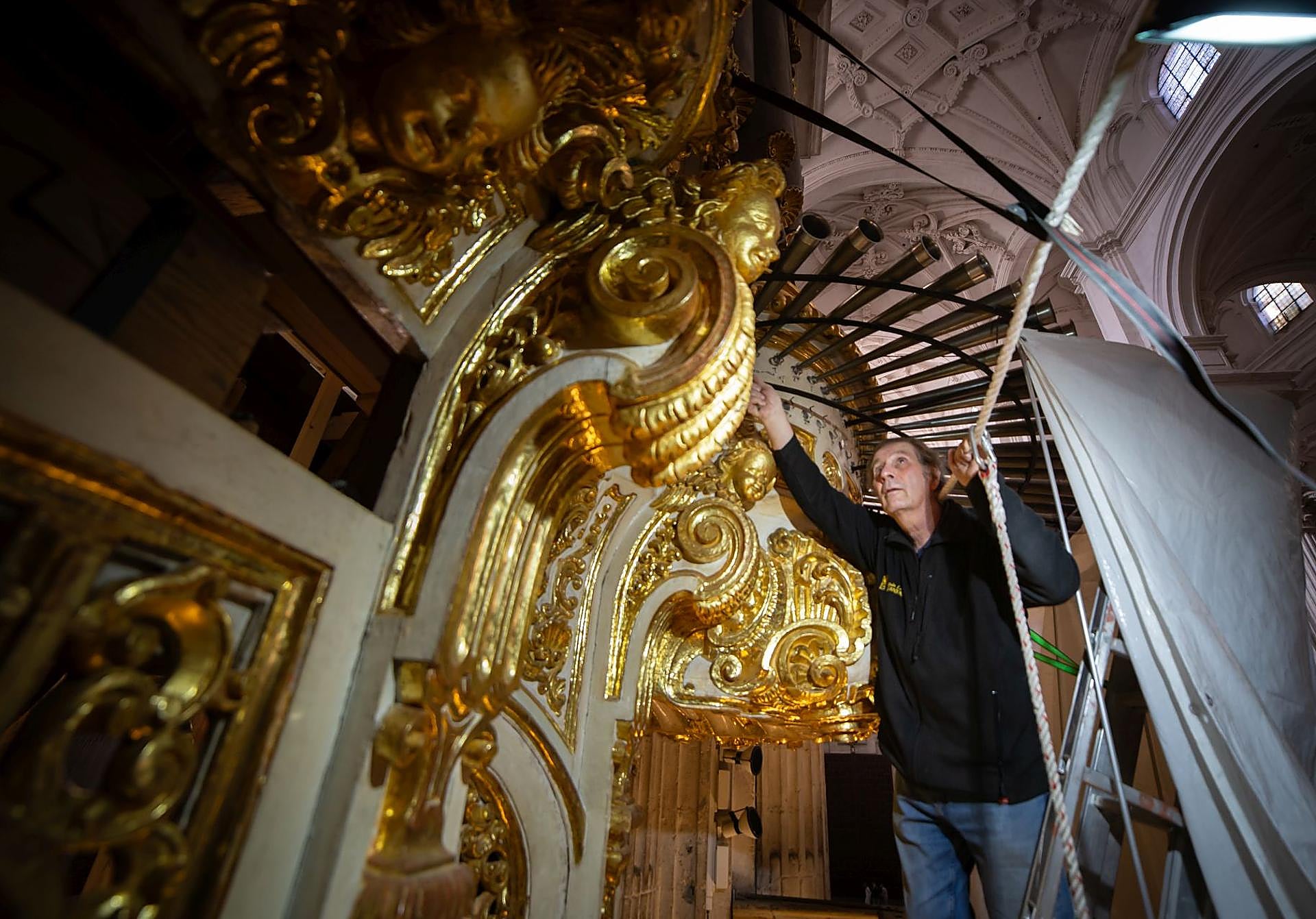 Para ello ha sido preciso un equipo multidisciplinar. En primer lugar, carpinteros, que se han encargado de la madera, apoyados por especialistas en policromía y dorados que ha devuelto al Órgano de la Epístola todo su esplendor. A todos ellos hay que sumar fotógrafos, diseñadores gráficos y expertos en secretos, fuelles y pieles, y los encargados de la reparación de toda tubería, realizada por una aleación de estaño y plomo. Ahora es el momento de los armonizadores y afinadores, que laboran cuando la Catedral está cerrada a la visita pública porque todas las pruebas suponen una emisión sonora constante.