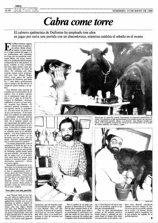 El ajedrez llegó a Deifontes en 1922, de mano de Don Francisco Pérez Muñoz, el párroco. Durante la Guerra Civil, todo el pueblo iba a la casa del cura a jugar y aprender. «Yo lo recuperé en 1975», dice Juan Manuel Muñoz. «Venían a jugar las mismas personas que jugaban en la Guerra y nosotros, los jóvenes». En 1990, Javier Díez Forcada publicó en IDEALel reportaje 'Cabra come torre', contando por primera vez la historia de Juan Manuel, lo que provocó que medios de todo el mundo viajaran a Deifontes para conocerle. «Aquello impulsó al pueblo. Organicé doce torneos aquí. El Open de Deifontes estaba considerado entre los mejores de España. Han venido grandes maestros de los cinco continentes». Deifontes es, por derecho, el pueblo del ajedrez. Un mérito en el que Juan Manuel, cabrero y profesor en el colegio durante treinta años, juega un papel imprescindible.