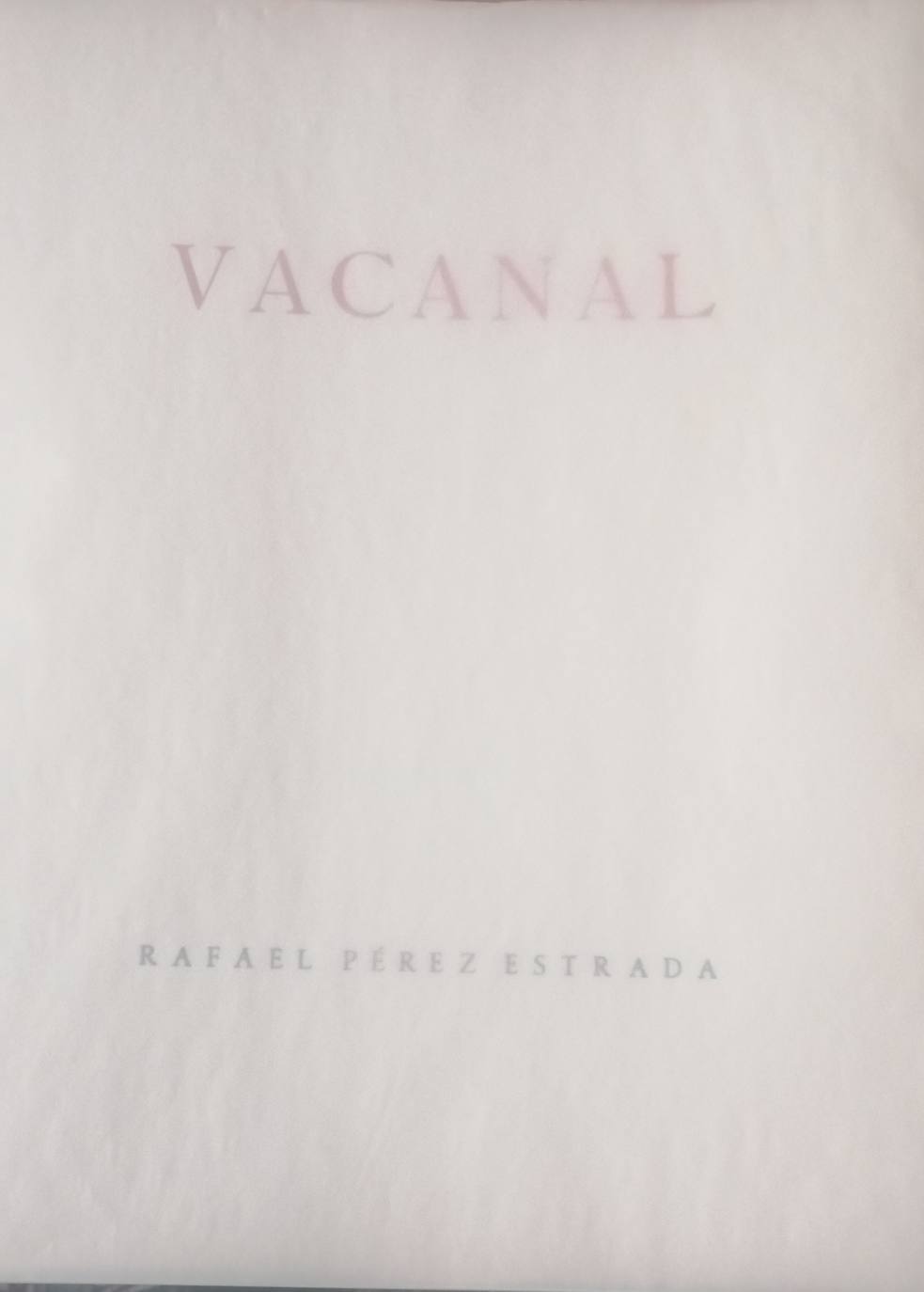 El Centro Cultural Generación del 27 y la Fundación Rafael Pérez Estrada se unen para dar a luz esta primera edición de Vacanal, es decir, un tesoro libresco que se amplía aún más si cabe, porque cuenta con los dibujos de ese excepcional artista que fue Pérez Estrada. Si histórica y metodológicamente se enmarca en el seno de la Promoción poética del 60, representa sin ninguna duda y de manera singular la poética de la caballerosidad. Excepcionalidad en toda regla donde se registra un estilo único que funde onirismo, reflexión, dramaturgia, escenificación, lirismo, literatura en estado máximo para el placer en toda su acepción.