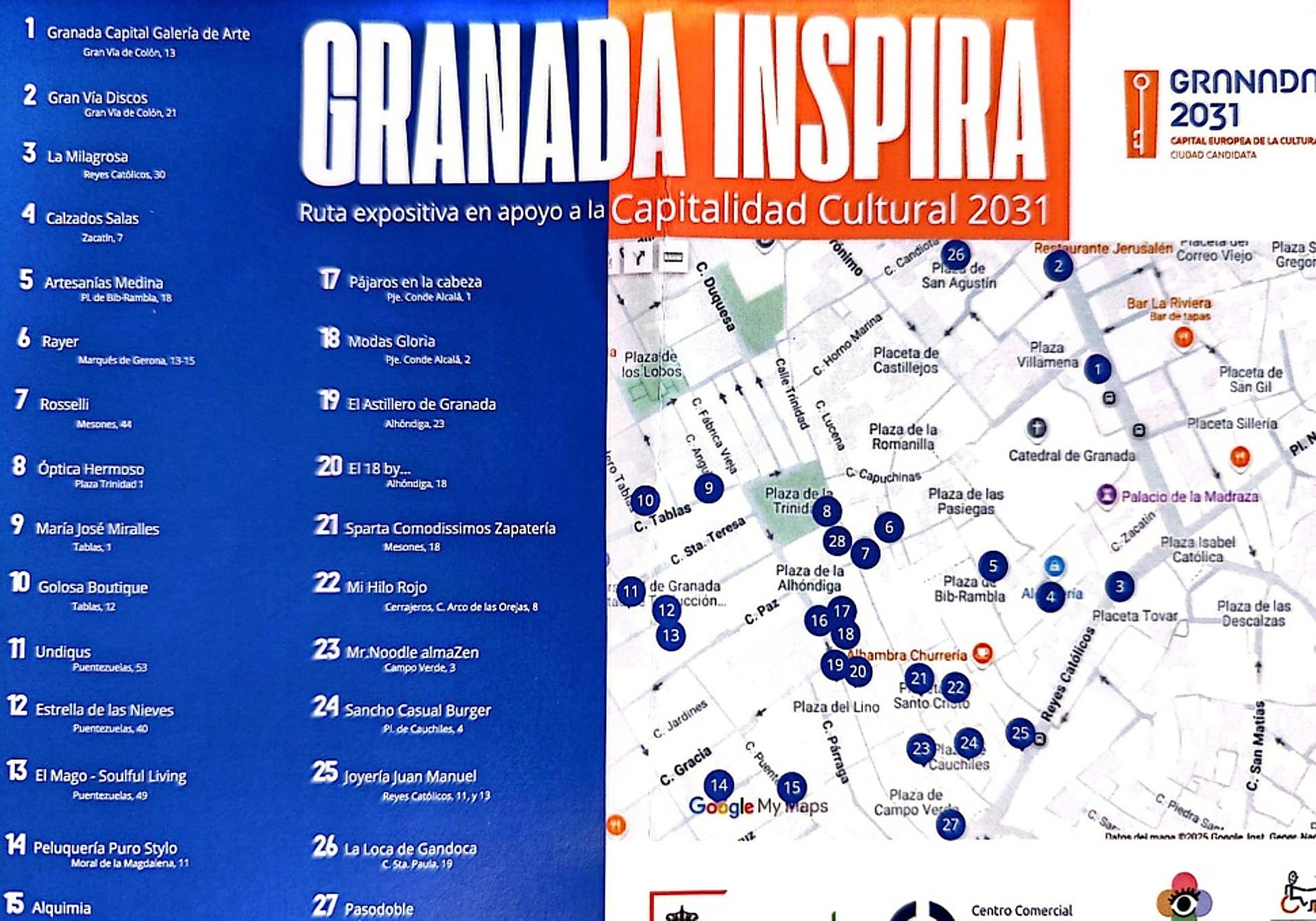 Este viernes se ha puesto en marcha una nueva iniciativa cultural en apoyo a la candidatura de Granada a la Capitalidad Cultural de Europa en ... 2031. Bajo el título de 'Granada Inspira', el Centro Comercial Abierto ha organizado una ruta con 28 espacios comerciales del centro, en la que van a exponer artistas con discapacidad, en un esfuerzo conjunto de la Asociación Arte Diverso y Visible, Cocemfe-Fegradi y los Hermanos Franciscanos de la Cruz Blanca. Las tres instituciones cuentan entre sus integrantes y usuarios con personas que ofrecen su propia visión de la realidad que les rodea.