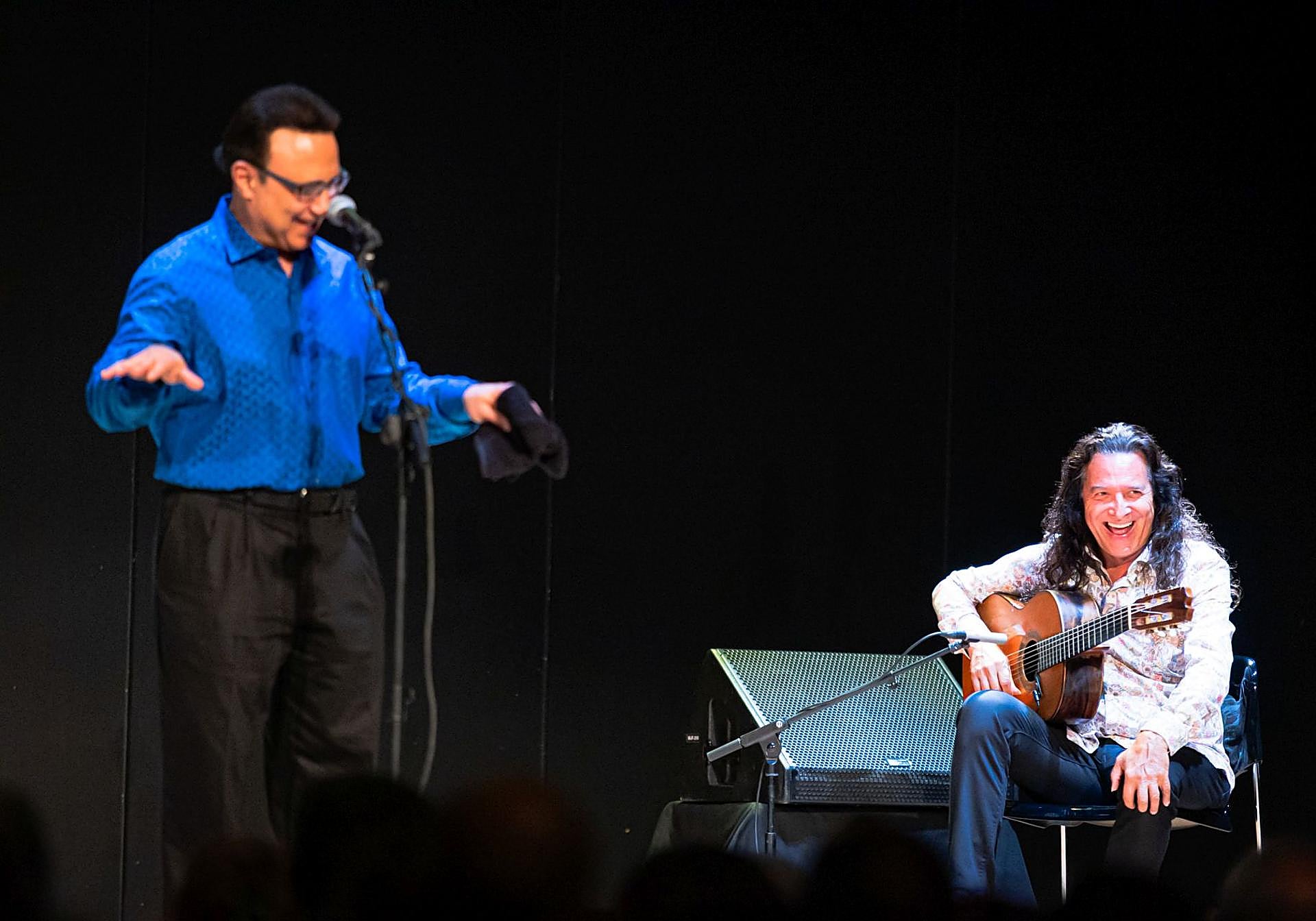 Los dedos de ambos se mueven como venidos del futuro, como si supieran exactamente lo que va a pasar antes de que el resto pueda intentar seguirles la pista. Una fascinación, una locura rítmica de la que parece que se desprenden emociones, sentimientos y un talento que obliga a la ovación. Y solo han tocado una. «Estamos encantados de tenerles esta noche aquí –dice Camilo, con camisa azul, tras estrecharle la mano a Tomatito, de blanco–. Llevamos casi 30 años juntos a través del mundo entero. Comenzamos el concierto con una obra maestra, el Libertango de Piazzolla, y seguimos con algo muy nuestro, la de Alfonsina y el Mar».