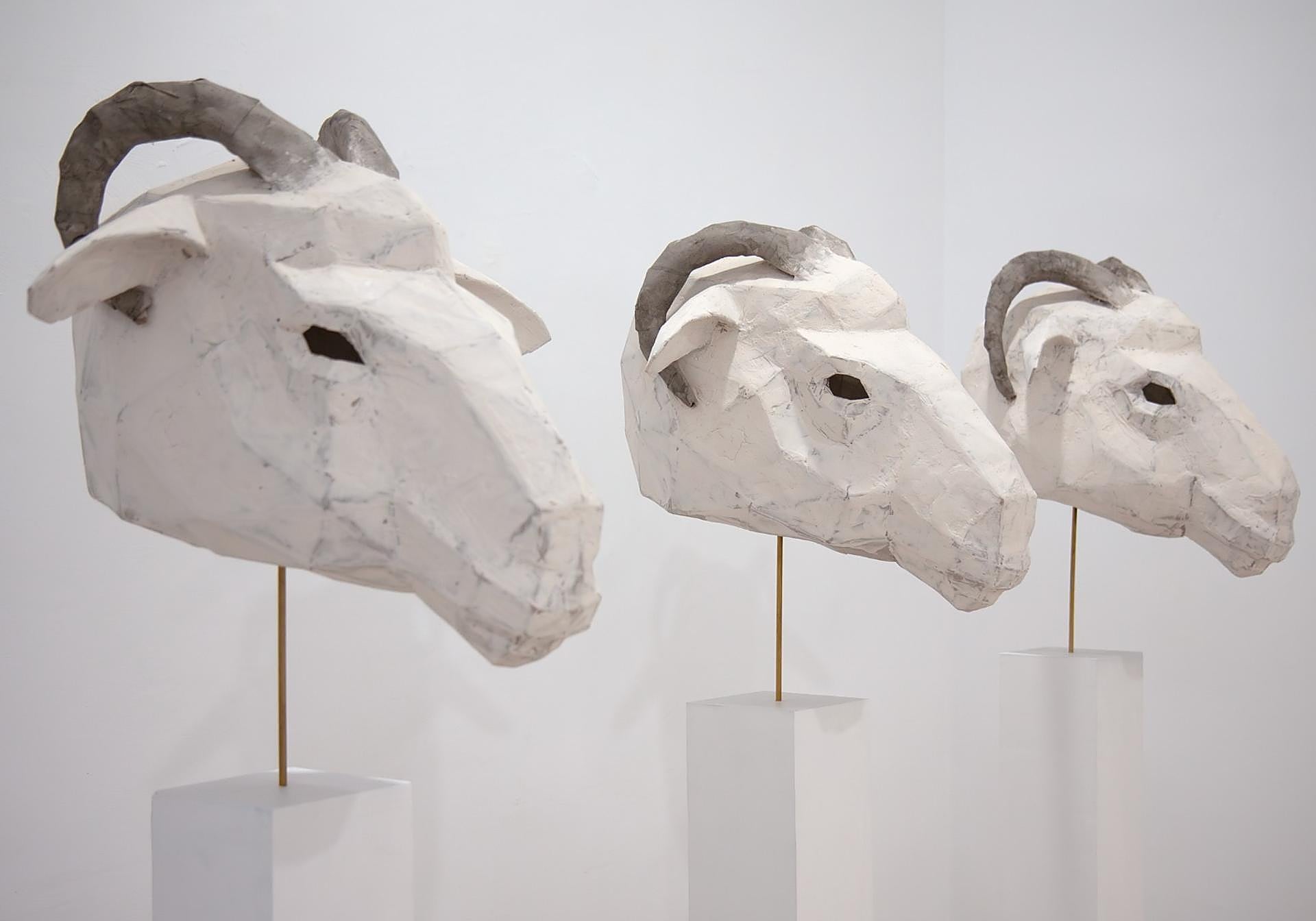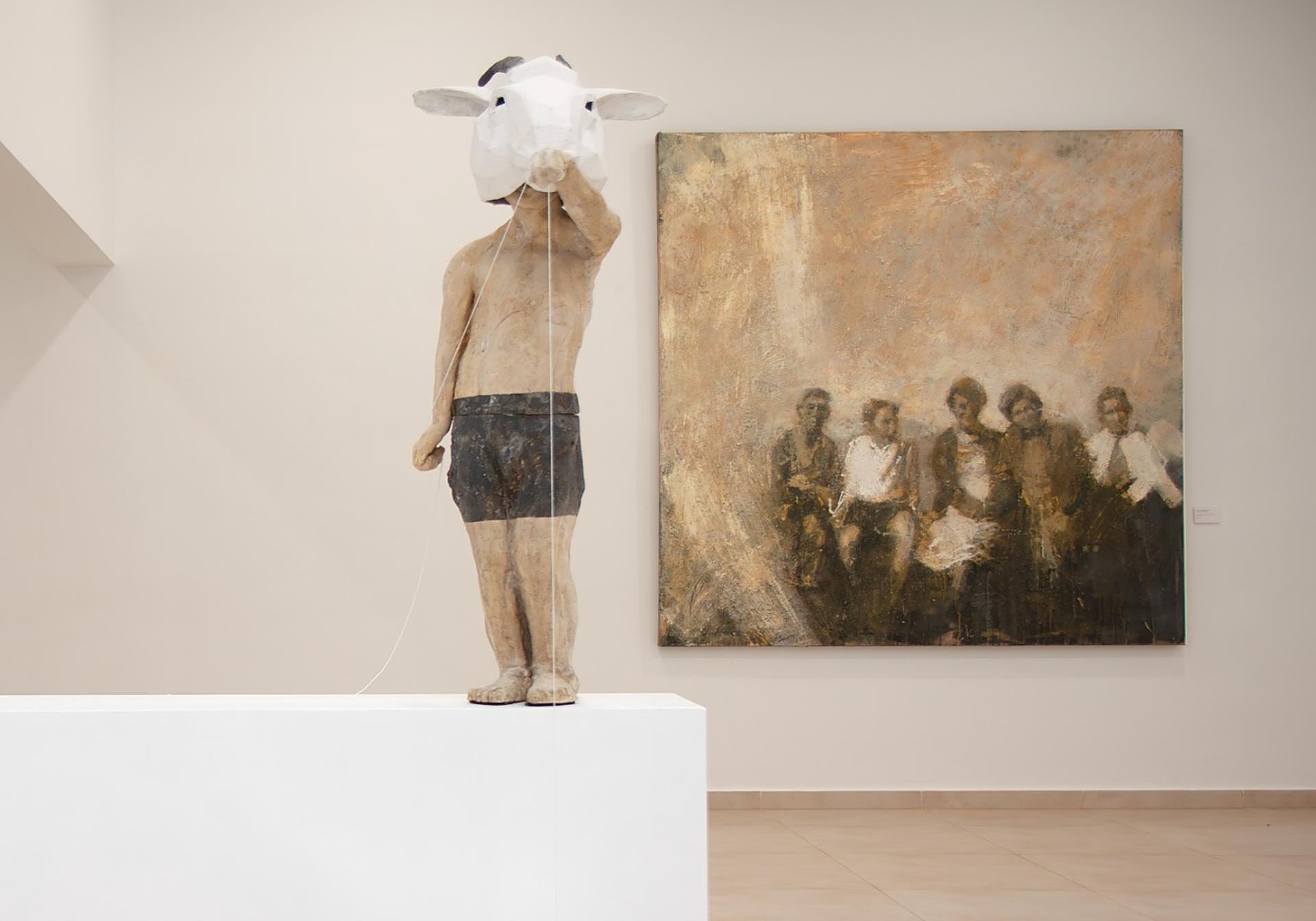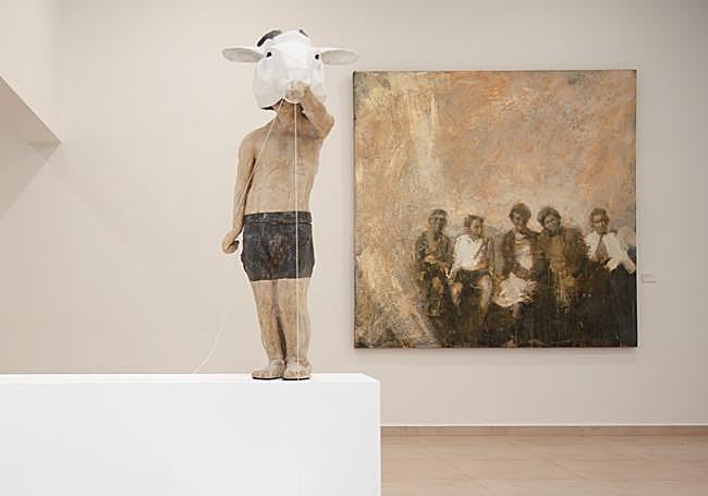 Junto a estas pinturas se exhibe la serie escultórica Yeso de Creta (Caretas), compuesta por tres cabezas de cabra realizadas en cartón y papel, que remiten a la tradición de los gigantes y cabezudos populares, suspendidas en el vacío como fragmentos de un ritual perdido. El recorrido culmina con la instalación escultórica Careta y cuchillo, una figura humana de aspecto hierático que sostiene un hilo del que cuelga una hoja dorada. La máscara animal, que sustituye su rostro, nos enfrenta de nuevo a la idea de transformación: ni del todo hombre, ni del todo bestia, ni del todo vivo. Una alegoría poderosa del tránsito entre el ser y el desaparecer.