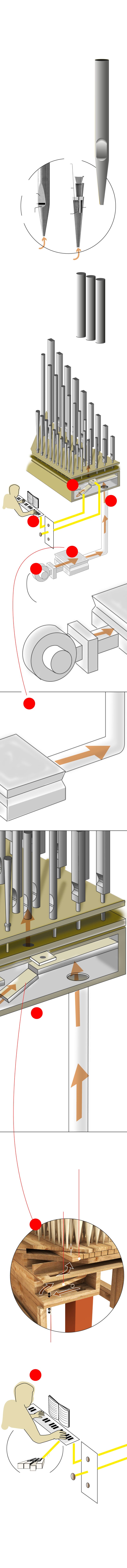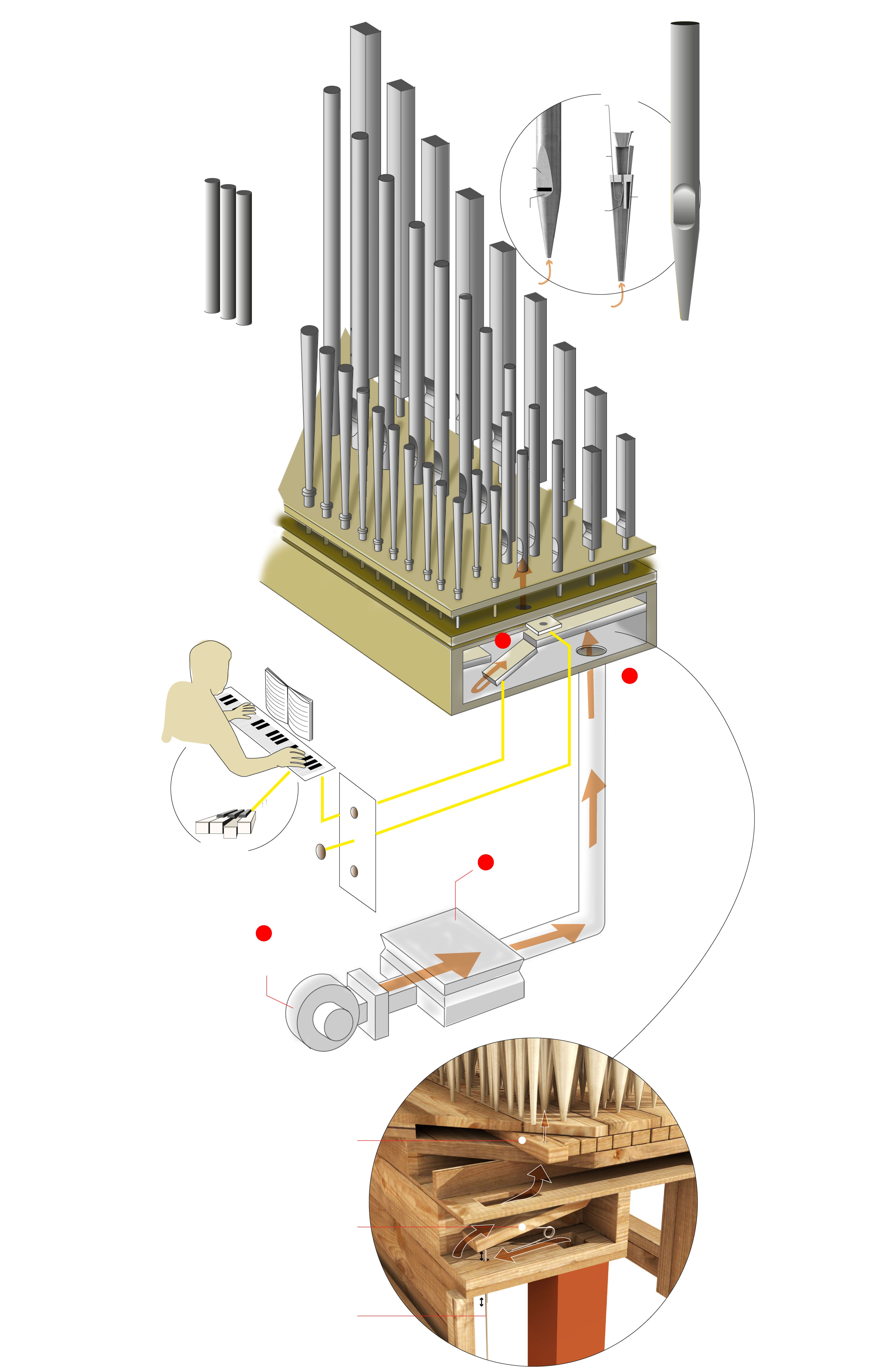 Cuando el organista tira del botón, un mecanismo mueve una tablilla de madera, llamada corredera