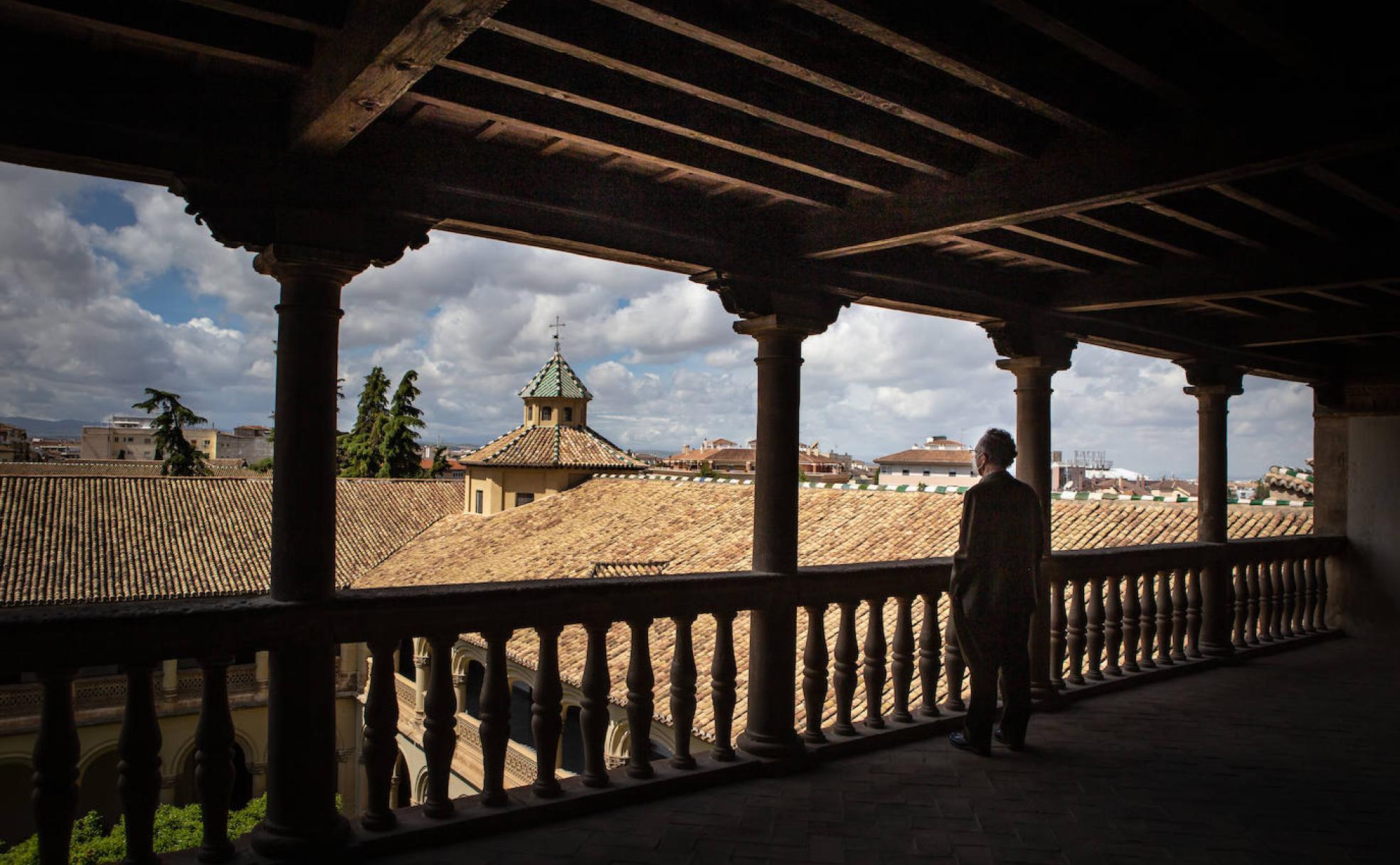 Ahora salimos al patio principal. Después de retirar unas cadenas, subimos a la planta superior a través de una escalinata. Al final del corredor hay otra escalera que conduce hasta el coro alto y hasta la torre. Ahí, en el tramo intermedio, hacemos otra parada. Abrimos otra de las puertas cerradas a cal y canto y arribamos hasta la 'Galería de los convalecientes', de unos cuarenta metros de longitud. Estamos hablando de un soportal que solo hallamos en los monasterios Jerónimos como lo fue originalmente el de San Lorenzo del Escorial –una nueva conexión, por cierto, con la figura de Felipe II–. Ahí pasaban sus días los monjes mayores y enfermos, disfrutando de la tranquilidad y de los rayos benéficos del sol. También de un paisaje que por aquel entonces era maravilloso. Se podía atisbar sin problemas toda la Vega de Granada –ahora tapada por los edificios–. El suelo es de adobe y la balaustrada de piedra arenisca típica de Granada. Otra curiosidad. Si bajamos la vista, observaremos que el pilón central del patio, donde florecen los naranjos, carece de la fuente. ¿Dónde está? Pues en la plaza del Campillo. Enfrente del restaurante Chikito.