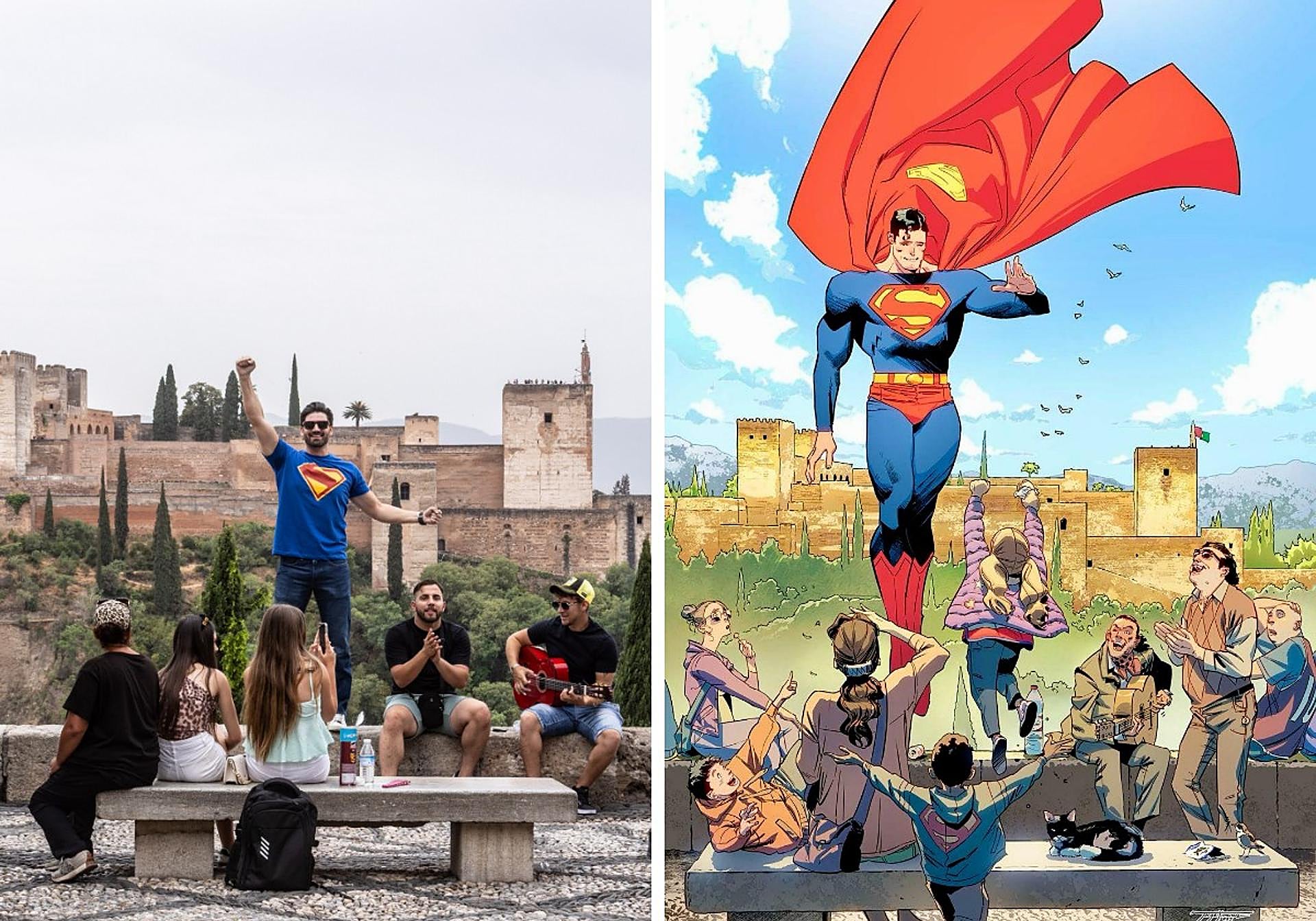 Antonio y Adrián cantan y tocan la guitarra en el mirador de San Nicolás. Los turistas están embelesados con la escena, entre la Alhambra, Sierra Nevada y la ciudad. De repente, un tipo se sube al poyete y sonríe a una cámara de fotos que dispara desde el otro lado de la plaza. «¿Ese es… Superman?», pregunta una niña que graba el momento con su móvil. El tipo, que viste una camiseta azul con una 'S' roja en el pecho, salta al suelo y se disculpa. «Perdón, soy el dibujante de esto», y muestra un puñado de postales que recrean un instante muy parecido a ese. Selene, una de las trabajadoras de la iglesia, se acerca a saludarle y le dice que Superman es su héroe favorito. «Había que traerle a Granada», responde el tipo. «Y de paso enseñar Granada al mundo a través de los ojos de Superman».
