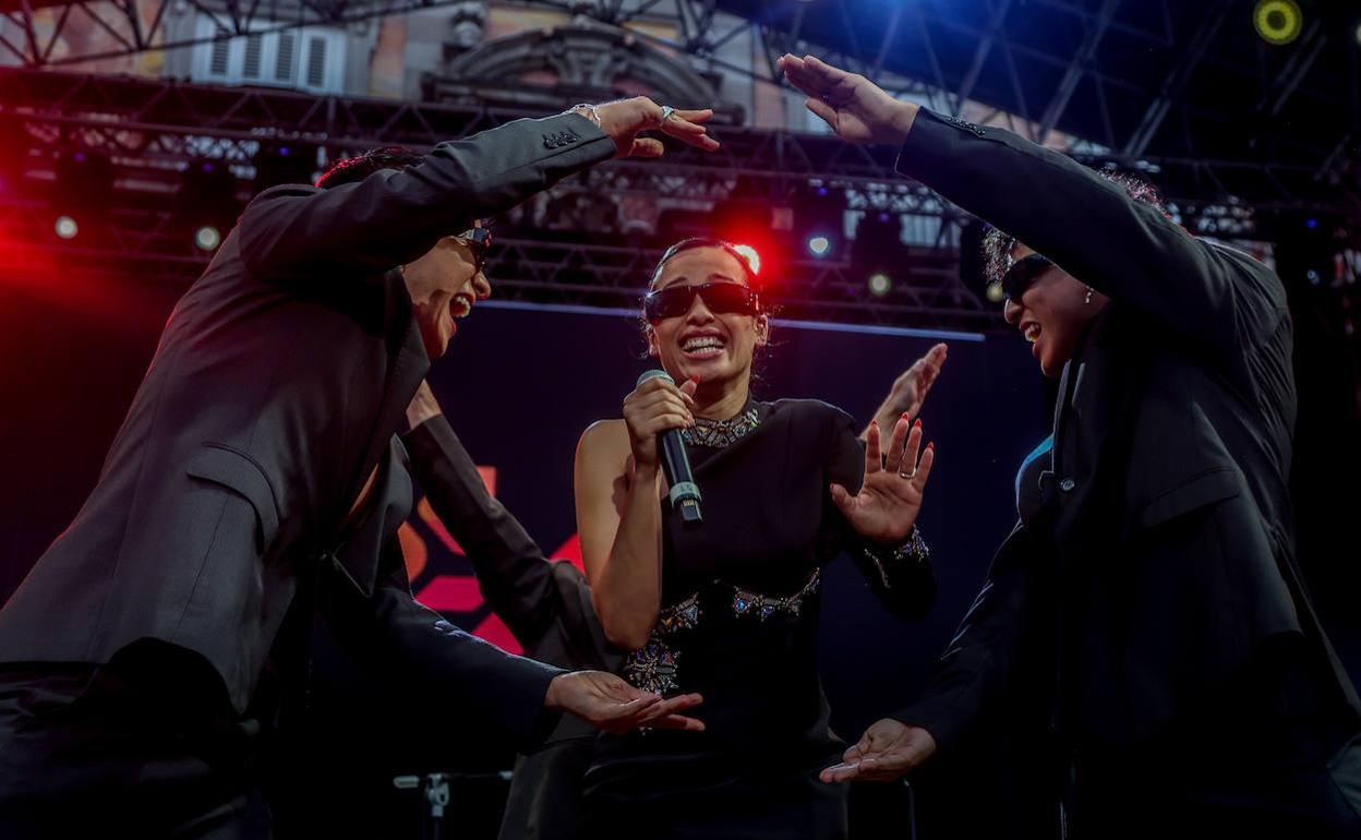 Ella entró al escenario al anochecer y la plaza vibró. Apareció con gafas de sol pues, según confesó, tenía conjuntivitis de tantas lágrimas de la emoción. «Nos sentimos ganadores morales», aseguró Chanel, que admitió haberlo pasado «increíblemente duro» hasta llegar a Turín. «Gracias por subiros al barquito de 'SloMo'», agregó ante un público heterogéneo y de todas las edades que la esperaba desde antes de las 18:00 horas, y que ondeó la bandera LGTBI, la trans y también la enseña nacional.