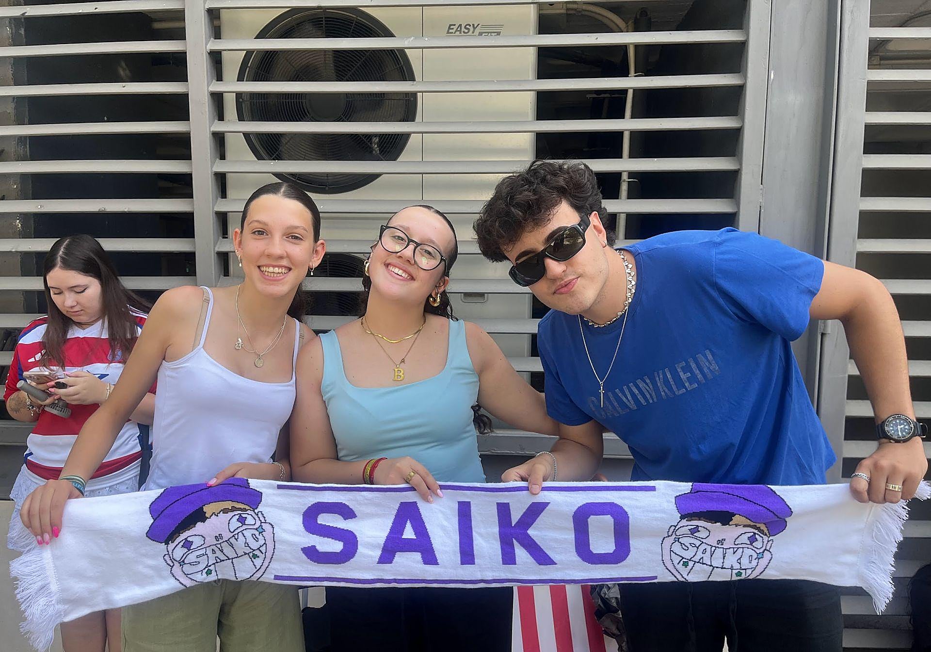 Otro grupo de cuatro chicas de entre 16 y 13 años llevaba esperando en cola desde las 4 de la mañana. Se llaman a sí mismas por dos nombres: «Pórtate bien, Saikito», en su grupo de WhatsApp, y «el grupo de fans número 1 de Saiko», para cualquier otra persona que pregunte. «Nos conoce y todo. Si es que somos sus vecinas», comentaba una de ellas. Y efectivamente, las fotos impresas en la pancarta que le habían hecho confirmaban que se lo habían encontrado más de una vez. «Un día por casualidad nos sentamos en el portal de su casa, pensando que estaba de gira, y nos lo encontramos. Cuando salió nos preguntó riéndose que si le estábamos esperando», contó otra de ellas.