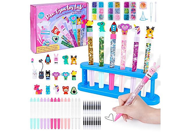 El kit de manualidades Kazzley incluye más de 55 piezas, como tapas decorativas, lentejuelas y accesorios variados, que permiten crear hasta 15 bolígrafos personalizados en formato DIY. Los usuarios pueden personalizar sus bolígrafos, expresando su estilo personal. Este kit proporciona las herramientas necesarias para realizar actividades creativas.