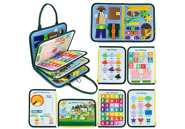 Con estructura tipo maletín, este busy board Montessori de fieltro presenta ocho paneles extraíbles con actividades educativas: colores, números, abecedario y formas, entre otros. El formato portátil y los materiales suaves facilitan el aprendizaje autónomo y seguro. Los nombres en inglés enriquecen la experiencia bilingüe, mientras que las piezas cosidas aportan tranquilidad y durabilidad.