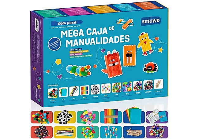 El kit creativo Smowo contiene más de 1000 piezas variadas, incluyendo materiales coloridos y accesorios para manualidades. Además, incluye un libro de instrucciones con diez proyectos creativos. Este kit ofrece una amplia variedad de materiales que permiten experimentar con diferentes combinaciones y técnicas, mejorando así las habilidades manuales.