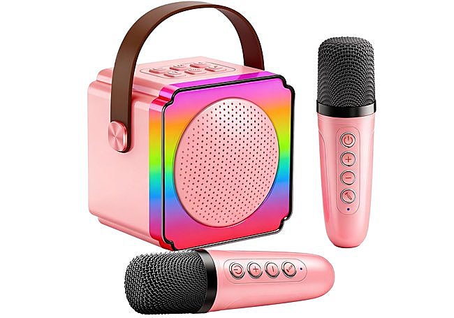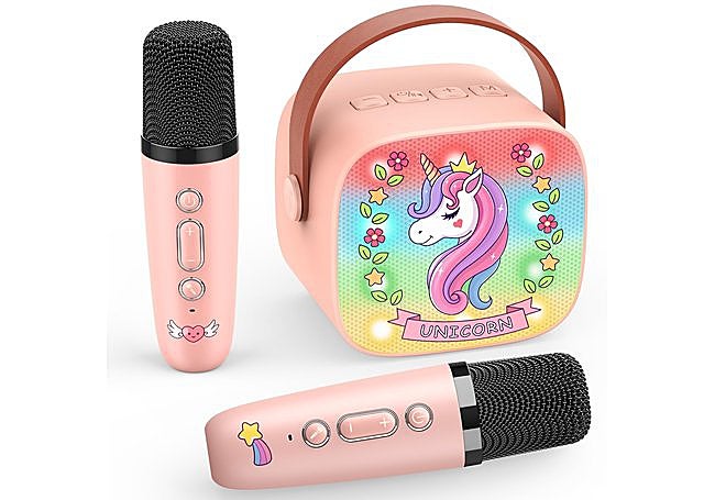 Con diseño de unicornio y dos micrófonos inalámbricos, este karaoke infantil Bluetooth tiene altavoces y ofrece efectos de cambio de voz en cuatro modos. Las luces LED se sincronizan con la música. Cuenta con conectividad Bluetooth 5.3 y es portátil, lo que facilita su uso en diferentes lugares.