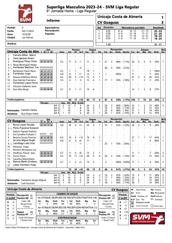 Unicaja Cosa de Almería mejoró su rendimiento con el saque, forzando Guaguas a errar por 2 con el ataque de Bezerra (13-19), aportando posteriormente lectura en la red por parte de Víctor Rodríguez que permitió que con el K-1 se acercaba a la victoria en el primer parcial (15-21), sin conseguir que Guaguas tuviera opciones de bloqueo. Víctor puntuó y Jean Pascal hizo un saque directo y un error (18-23) y, tras un error de Jorge Fernández, hubo tiempo de Carreño. A la vuelta, Fran Ruiz puso bola de set (19-24) y los errores forzaron otro tiempo de Carreño (21-24). El saque de Nico Bruno se enquistó y Matt Neaves lo cerró por 2.