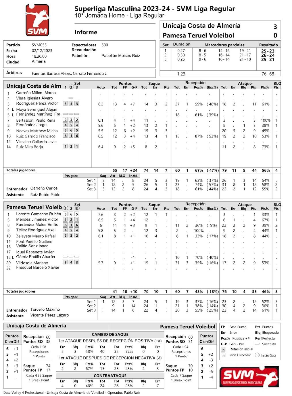 Incidencias. Partido correspondiente a la jornada décima de la fase regular de la Superliga Masculina de Voleibol, celebrado en el Pabellón Moisés Ruiz de Almería, con premio de entrada gratuita para los asistentes con entrega de juguetes. Se entregó una camiseta de Unicaja al CV Teruel por ser el partido número cien entre ambos equipos.