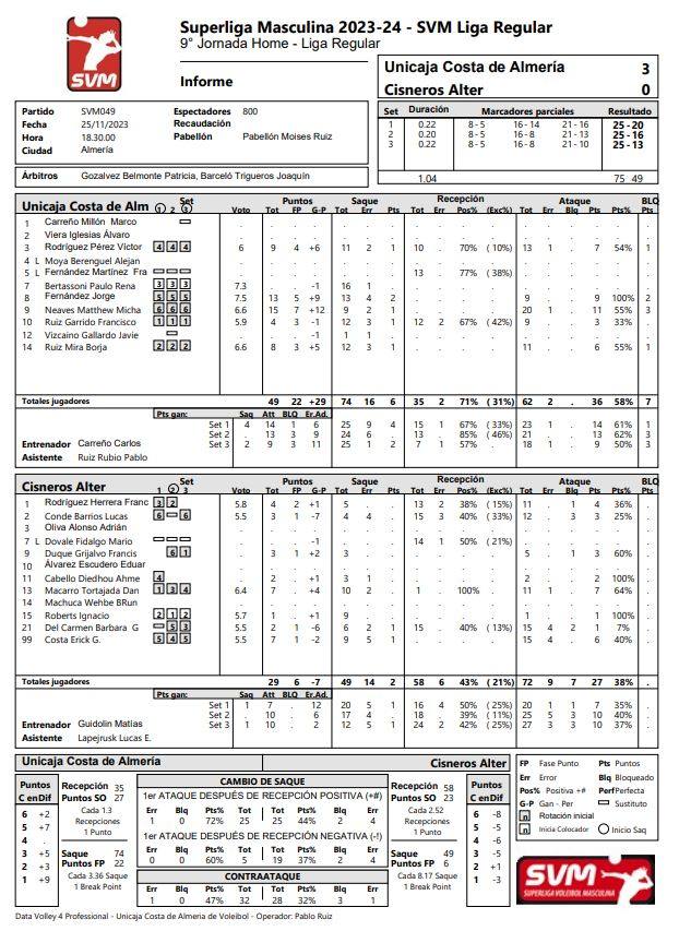 Incidencias: Partido de la novena jornada de la Superliga Masculina celebrado en el Pabellón Moisés Ruiz de Almería, con dedicatoria para ASALSIDO, Asociación Almeriense para el Síndrome de Down.