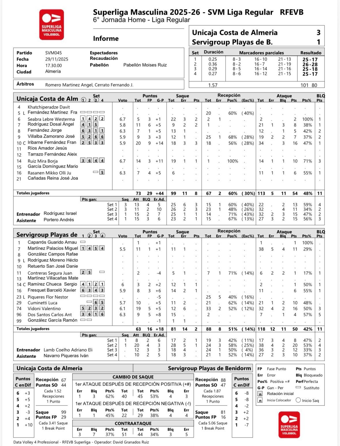 Unicaja Costa de Almería construyó su victoria desde el primer balón, imponiendo un ritmo que desarmó por completo a un Benidorm superado por la contundencia ... del saque almeriense y por una lectura de bloqueo que fue creciendo punto a punto. El conjunto blanquiverde gobernó el partido con una defensa muy sólida, una recepción estable y una presencia constante en la red que condicionó cualquier intento de respuesta rival. Desde los primeros intercambios se percibió una superioridad que no solo marcó la tendencia del set inicial, sino que estableció un patrón competitivo basado en el orden, la intensidad y la claridad táctica con la que interpretó cada fase del juego.