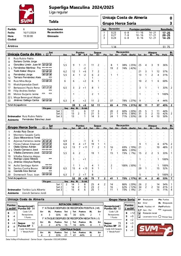 Unicaja Costa de Almería no estuvo en Los Pajaritos. Se personó en los inicios de set, pero ante la solvencia del juego de Grupo Herce ... Soria no hubo nunca 'salida', sólo acceso a un túnel que sumió al equipo blanquiverde en una pesadilla, sin capacidad de salir de ella, 'dando vueltas y vueltas' como 'atrapado en el tiempo'. Y es que nunca tuvo capacidad de estar cerca cuando los puntos 'suman doble' porque sufres la capacidad de anotar del rival y la incapacidad propia para, al menos, molestar en ese preciso momento.