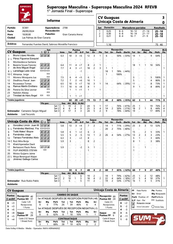 Si se ven los parciales, se hace la lectura. Si se mira la estadística se 'descubren' otras cosas. La resistencia almeriense no dio para mucho. Un 71% en ataque significa que defensa hubo poca, casi ninguna, y Guaguas con una excelencia en el juego sin tacha, ni réplica. Puede que, como ya pasara en la última Supercopa jugada y perdida, al equipo le faltó rodaje, pero lo visto no ilusiona. A ver qué pasa en la Liga, que empieza el próximo sábado, en Los Planos, visitando a Teruel. A día de hoy, encefalograma plano, tras un deficiente partido en el que Guaguas exhibió un gran poderío, tanto en ataque como en defensa, pues de lo que atacó el equipo almeriense, sólo 27 fueron puntos. De los otros 41 balones, 9 fueron bloqueados, 7 fueron fuera y 25 fueron controlados por un Guaguas imparable en ataque. Con una cosa y con otra, ganar es una utopía. Toca esperar tiempos mejores, si llegan.