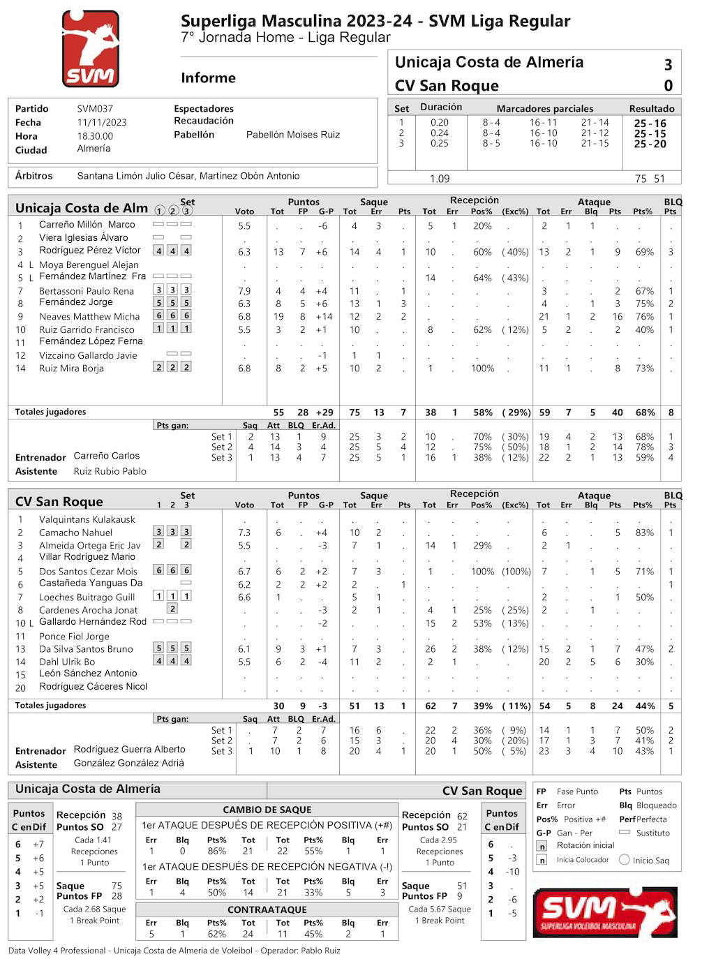 Guillermo Loeches (1), Eric Almeida (0), Nahuel Camacho (6), Bo Dahl (6), Bruno da Silva (9) y Moisés Cézar (6) -sexteto inicial-. También jugaron Gallardo (líbero), Jonathan Cardenes (0) y Dani Castañeda (2). Anotaciones: 24 puntos de 54 ataques, con un 44% de acierto; 5 puntos de bloqueo, 1 de saque sobre 51 intentados y 21 por errores del contrario.