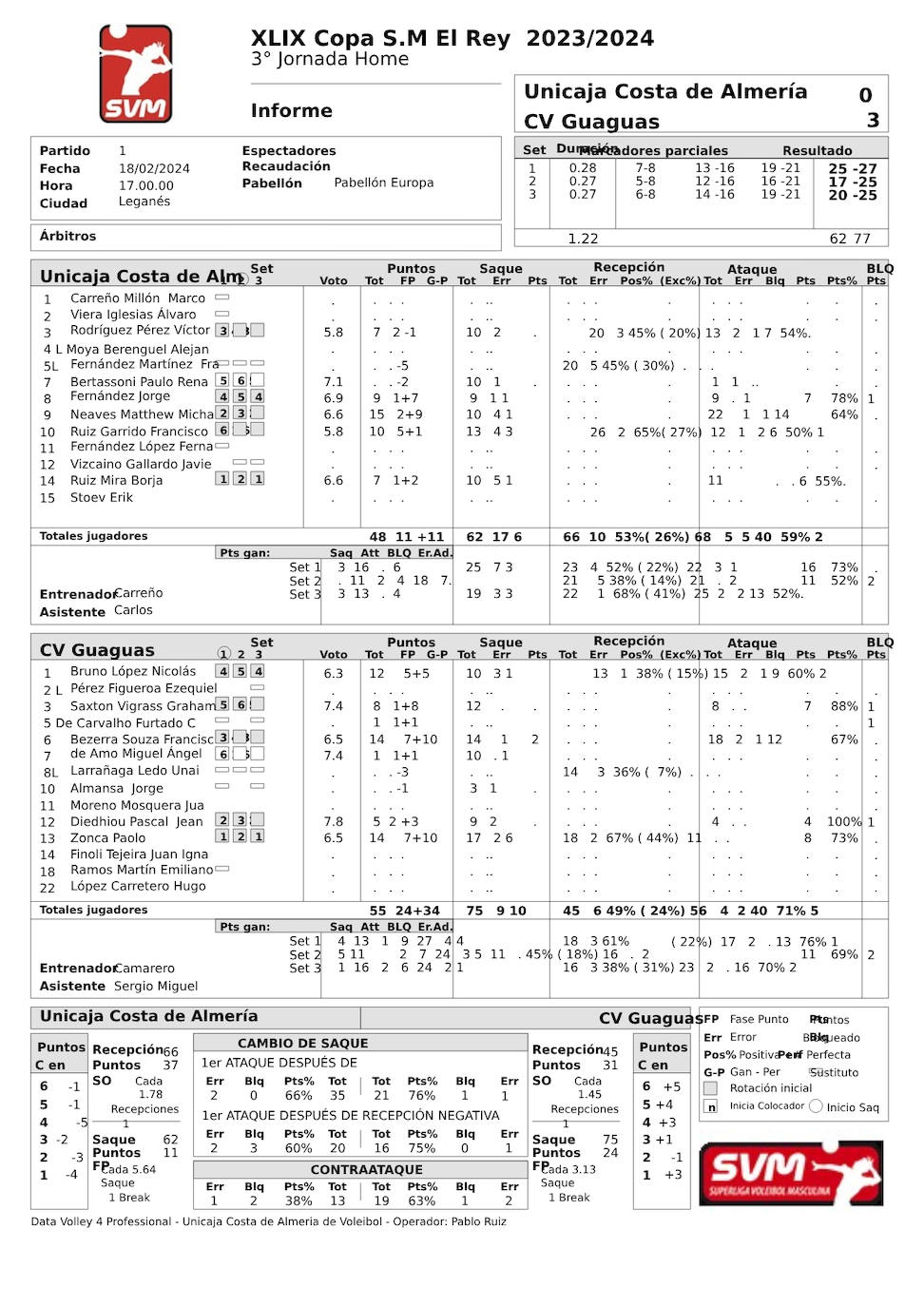 El equipo insular se mostró superior, aunque los blanquiverdes tuvieron opciones en el primer set; luego, el rodillo insular supero a los de Carlos CarreñoNo fue posible. Era mucho esperar. Guaguas Las Palmas, con un excelente comportamiento en saque y defensa, se impuso a un Unicaja Costa de Almería ... que tuvo que utilizar el riesgo para estar en cada uno de los tres sets disputados y que pudo haberse anotado el primero. Ese resultado final (25-27) pudo jugar en contra de un equipo almeriense que tuvo que jugar a remolque de un gran rival, favorito al título y que lo confirmó a base de un buen rendimiento. Sobre todo en ataque y como consecuencia de una gran defensa, también por la interpretación que Miguel Ángel de Amo hizo de la recepción con la que jugó el equipo insular.