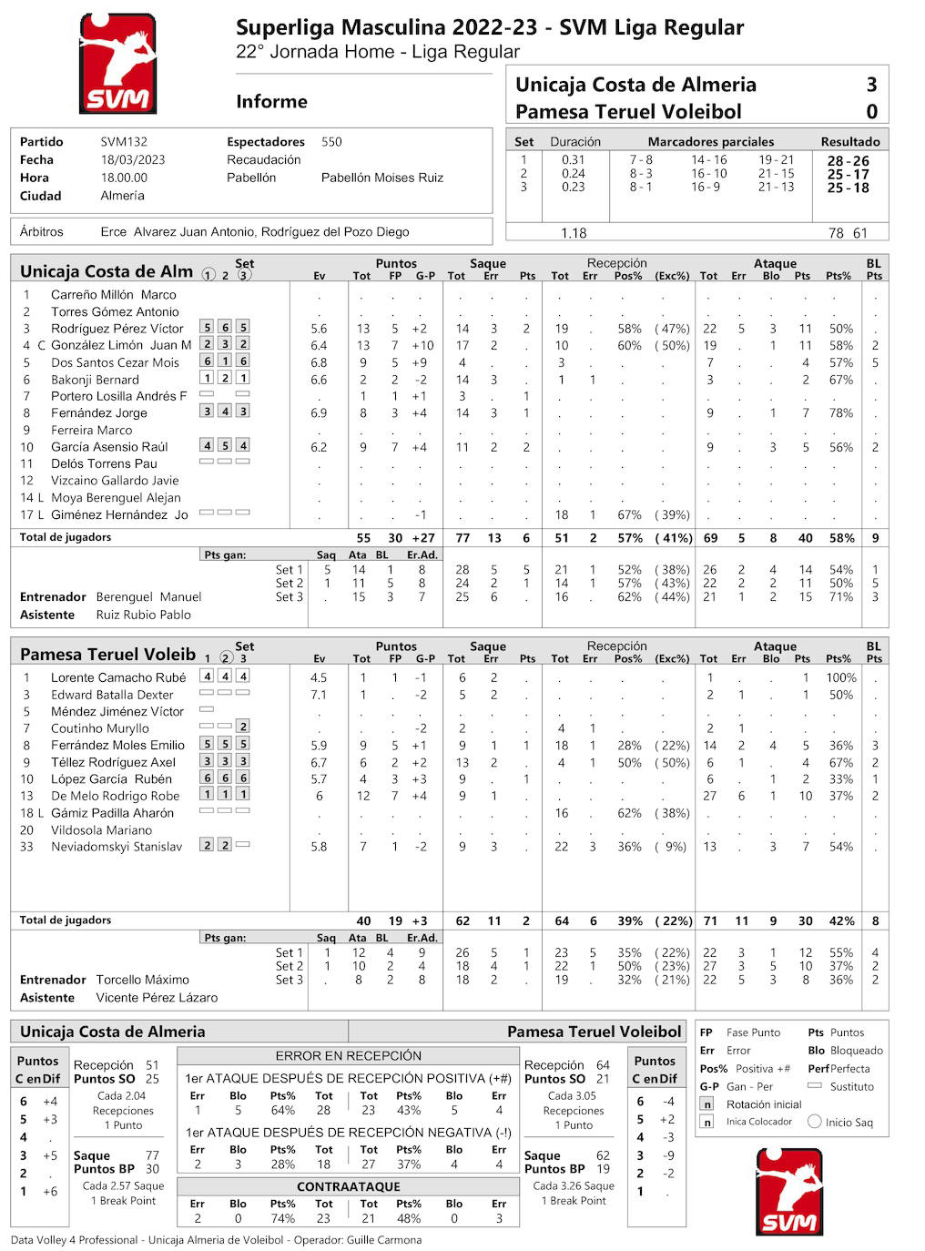 Con 13-4, el técnico turolense tuvo que poner freno a la sangría porque los blanquiverdes, a base de lectura y del buen saque de García Asensio mandó con solvencia, apareciendo también Víctor Rodríguez y Juanmi González haciendo daño con el ataque. Este mejoró en los naranjas a base de la aportación de sus jugadores de punta Pernambuco y Neviadomskyi, a los que ayudaron Rubén López y Téllez, el primero con el saque y el segundo con el bloqueo. Mondi paró el set (14-8).