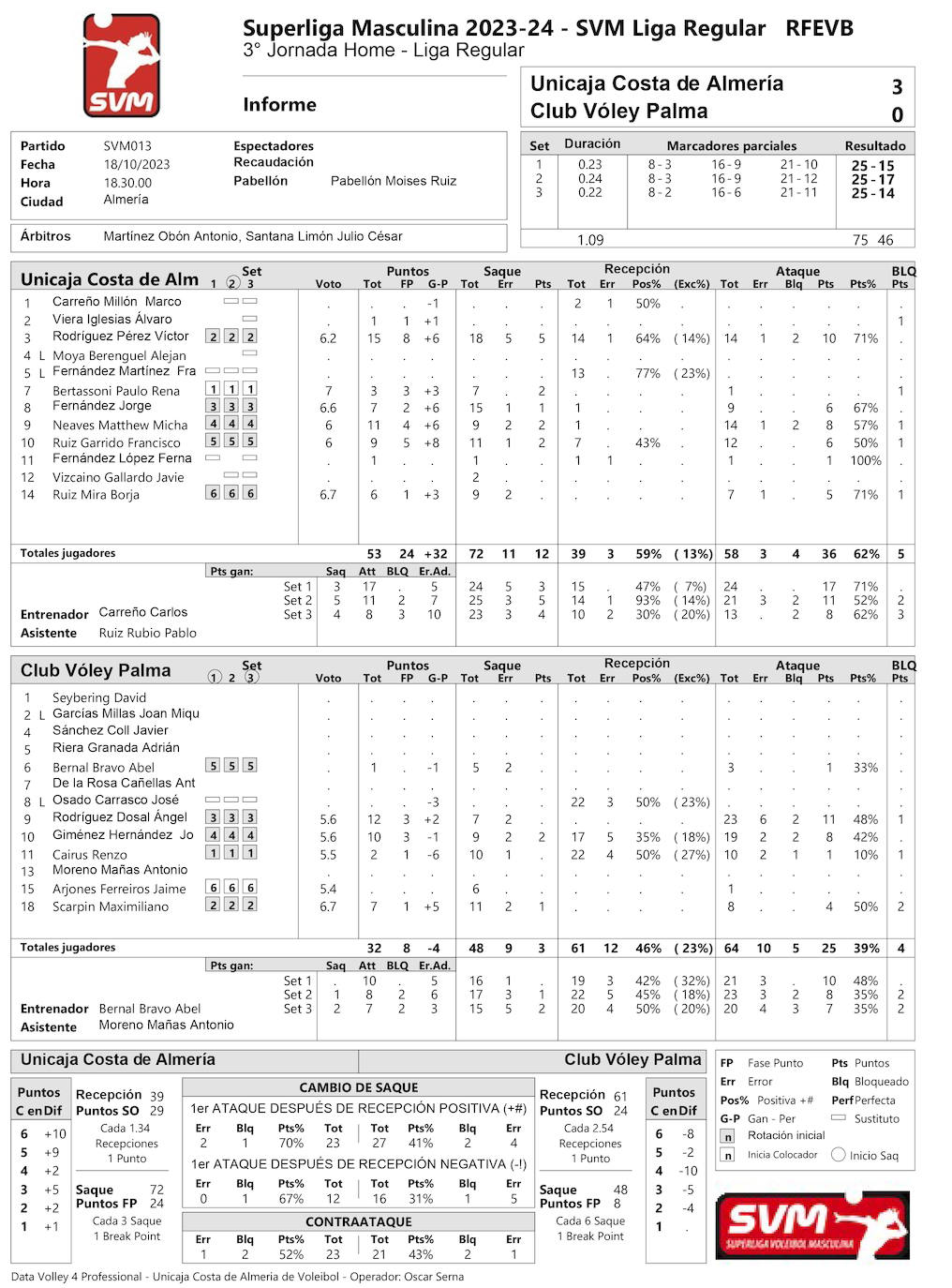 Paulo Renán Bertassoni (3), Víctor Rodríguez (15), Jorge Fernández (7), Matt Neaves (11), Fran Ruiz (9( y Borja Ruiz (6) -sexteto inicial-. También jugaron Paquillo Fernández (líbero), Fernando Fernández (1), Álex Moya (líbero), Marco Carreño (0), Javi Vizcaíno (0) y Álvaro Viera (1). Anotaciones 36 puntos sobre 58 intentados (62%), 5 puntos de bloqueo, 12 de saque y 22 por errores del contrario.
