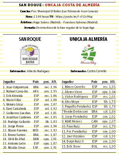 El CV San Roque Batán luchó por meterse en la Copa del Rey 'a la primera', o sea, nada más ascender a la Superliga. No ... lo logró por poco, así que debe considerársele un equipo que, sin duda, tiene ese nivel. Lo dice también su clasificación actual, octavo, con la que, ahora sí, sería de los ocho que lucharán por el cetro copero desde el próximo jueves. Es por ello que se trata de un excelente rival para Unicaja Costa de Almería justo en este momento. Será hoy domingo –el día es la única 'pega' por acortar el tiempo, máxime con el largo desplazamiento que conlleva– un partido de la máxima exigencia, perfecto para dejar todo listo en la preparación para luchar por avanzar hasta las semifinales del 'Torneo del KO'.