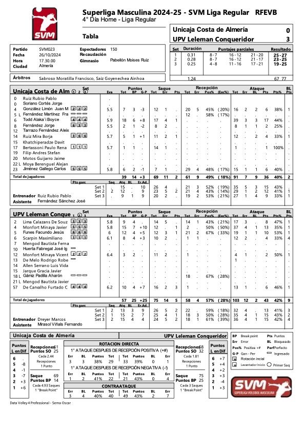El comienzo del segundo set tuvo de nuevo una buena lectura por parte ahorradora, que cerró por punta y en defensa para contraatacar y poner un buen 3-0 en el marcador. El intercambio de golpes fue limpio hasta que Léleman comenzó a fallar en ataque, gracias también a la incidencia del saque de Borja Ruiz (11-7). Hubo reparto de errores, con racha 'mala' de Unicaja Costa de Almería que permitió a Valencia 'acercarse' (14-12), pero la posterior de Léleman le hizo irse a cinco puntos (17-12), con tiempo de Marcos Dreyer tras un saque de Alaka'i Todd que dio en la espalda de Calazans.