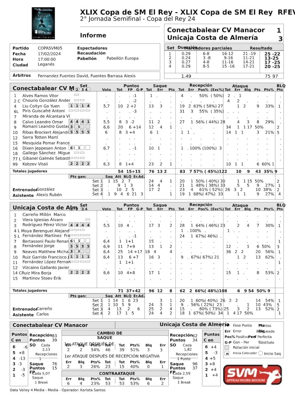 Unicaja Costa de Almería, con un buen saque, condujo a Manacor a salir sólo por punta, con mucho error. A la inversa, los blanquiverdes comprometían la lectura por una buena recepción que Bertassoni aprovechó para distribuir con solvencia (17-9), con Víctor Rodríguez hundiendo al rival (19-9), con Fran Ruiz luciéndose por punta. El riesgo de ambos acercó a Unicaja Costa de Almería a un triunfo claro para, tras error manacorí, gozar de 11 puntos de set que lo aprovechó a la primera con un ataque de Jorge Fernández.