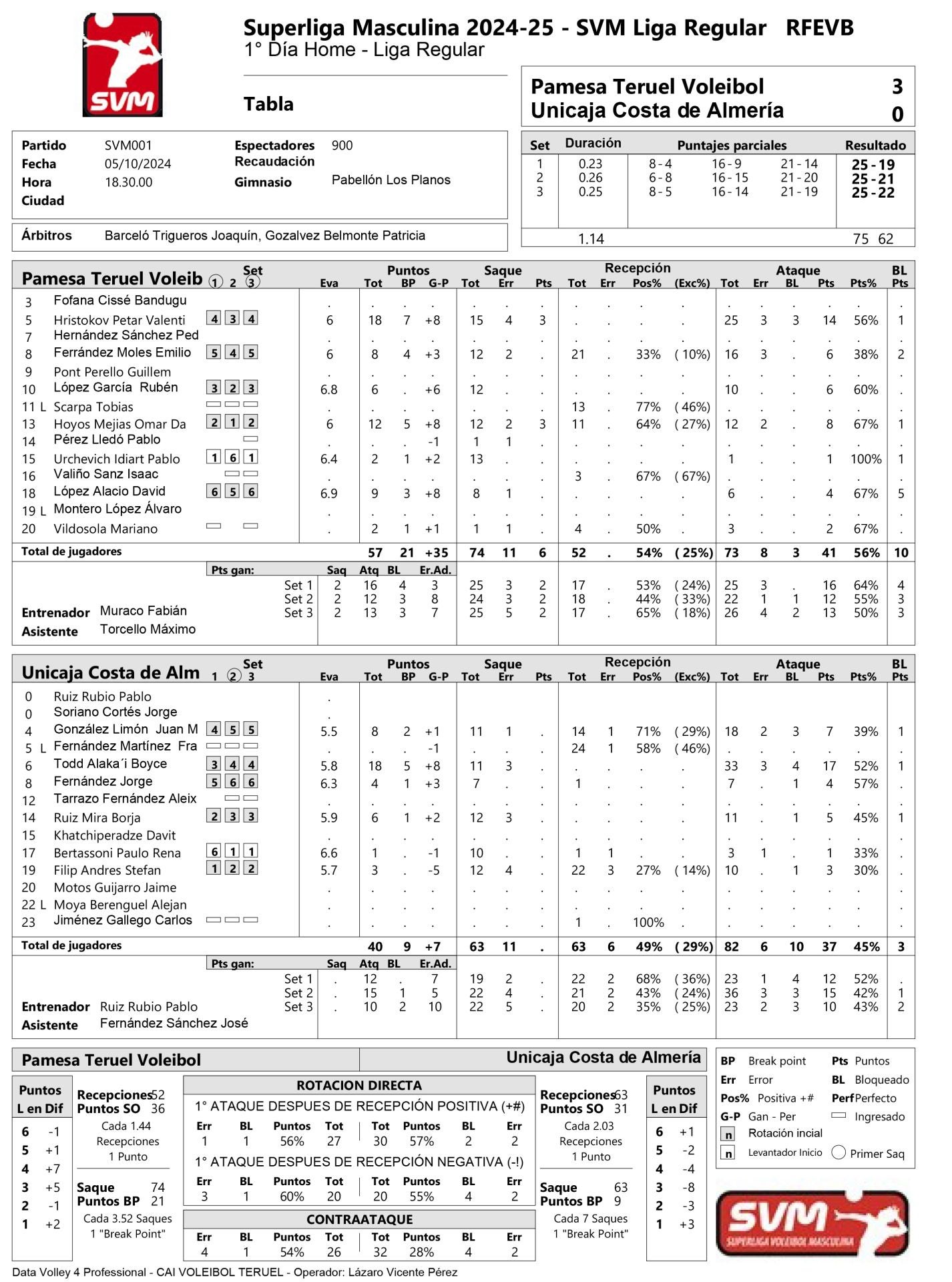 Empataron como máximo anotadores del partido los dos opuestos, Alaka'i Todd por parte blanquiverde y Hristoskov por parte del conjunto naranja, ambos con 18 puntos, un 52% y un 56% de efectividad a cada uno sobre 33 y 25 balones respectivamente. En saque, seis puntos directos para el cuadro local por ninguno bando almeriense, con la importancia que tiene este fundamento en el voleibol moderno que sirve para subsanar los errores, que fueron de 11 para cada equipo. Los porcentajes de recepción fueron mejores también para Pamesa Teruel, destacando el líbero Scarpa y, con todo en relación, también hubo diferencia amplia en bloqueo, 10 para los de Muraco, cinco del exahorrador David López, por solo 3 para los de Ruiz. Se gestionó peor el contraataque, dentro de unos porcentajes de acierto atacante también dispares (45% frente a 56%).