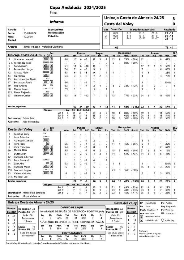 El equipo almeriense jugó con solvencia en ataque, con la conexión entre Paulo Renan Bertassoni y el norteamericano Alaka'i Todd, finalizando el ataque por punta con poderío (20-7). Una ventaja para no tener zozobra y finalizar la primera manga con 25-11.